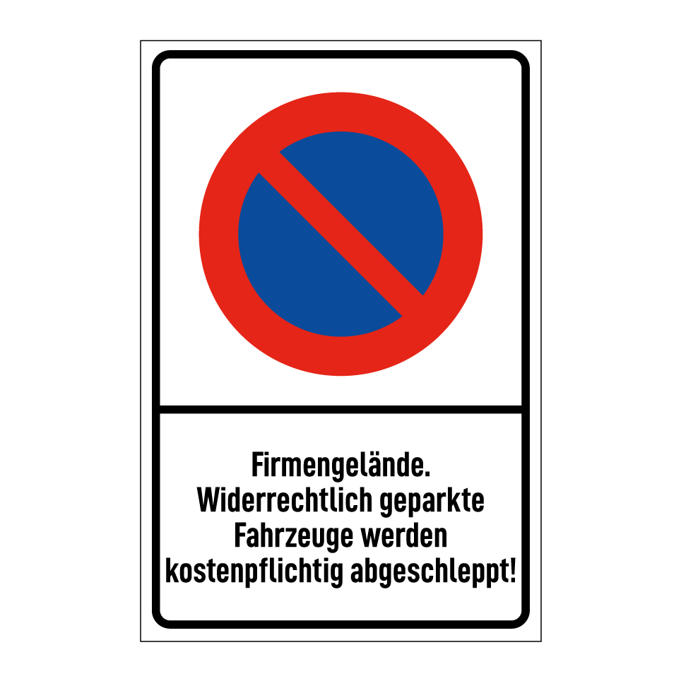 Parkverbotsschild mit dem Text Firmengelände. Widerrechtlich geparkte Fahrzeuge werden kostenpflichtig abgeschleppt!