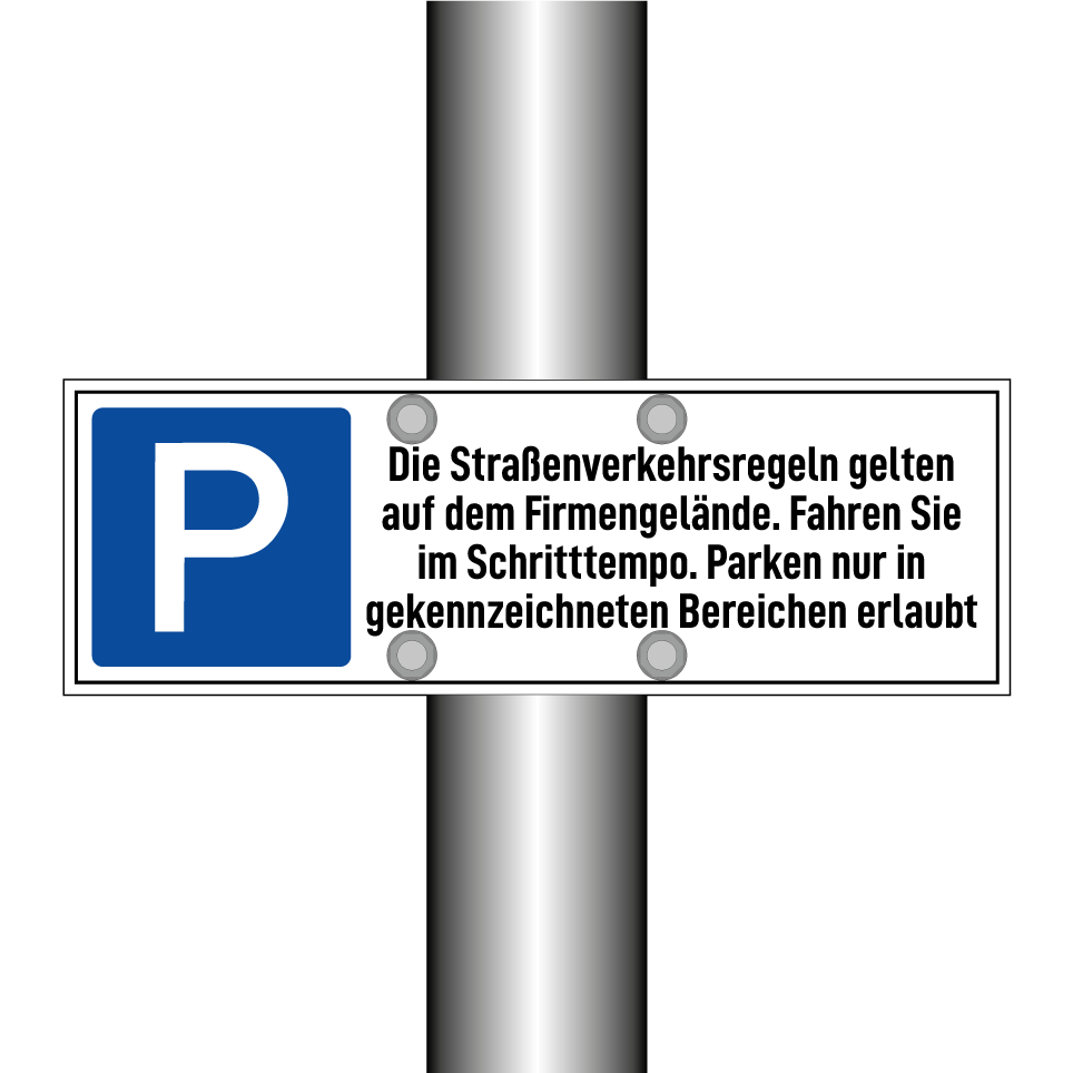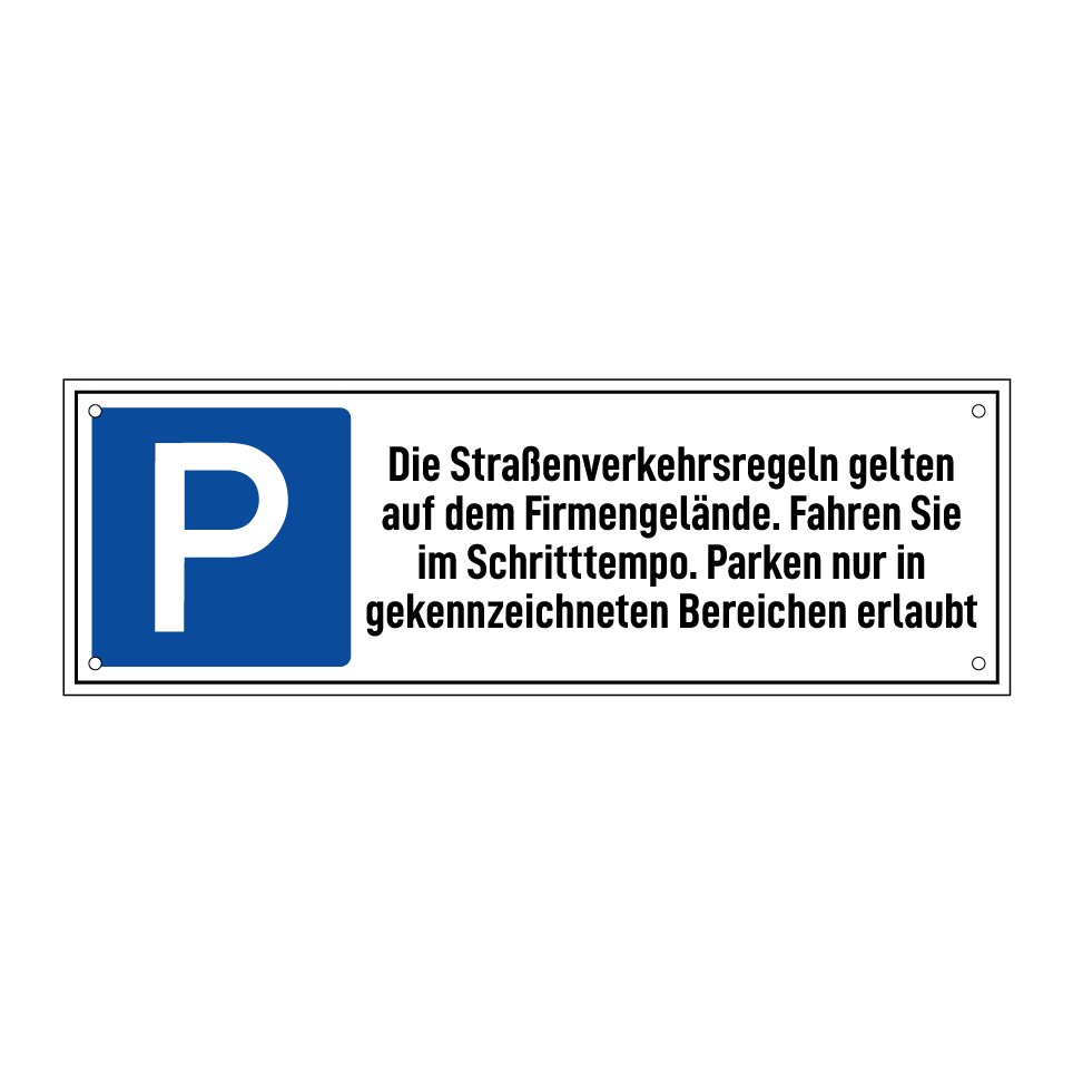 Parkschild mit dem Text Die Straßenverkehrsregeln gelten auf dem Firmengelände. Fahren Sie im Schritttempo. Parken nur in gekennzeichneten Bereichen erlaubt