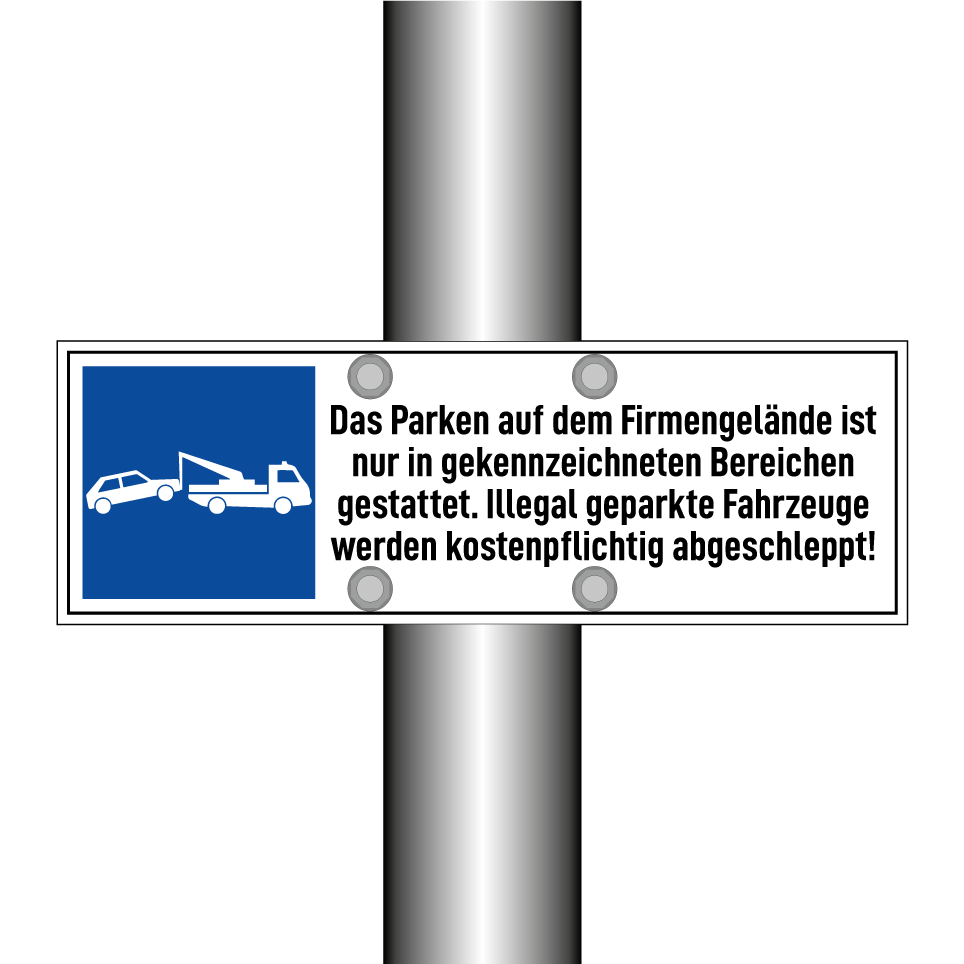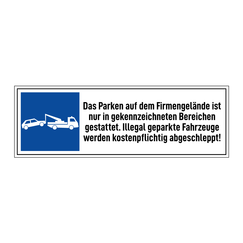 Parkschild mit dem Text Das Parken auf dem Firmengelände ist nur in gekennzeichneten Bereichen gestattet. Illegal geparkte Fahrzeuge werden kostenpflichtig abgeschleppt!