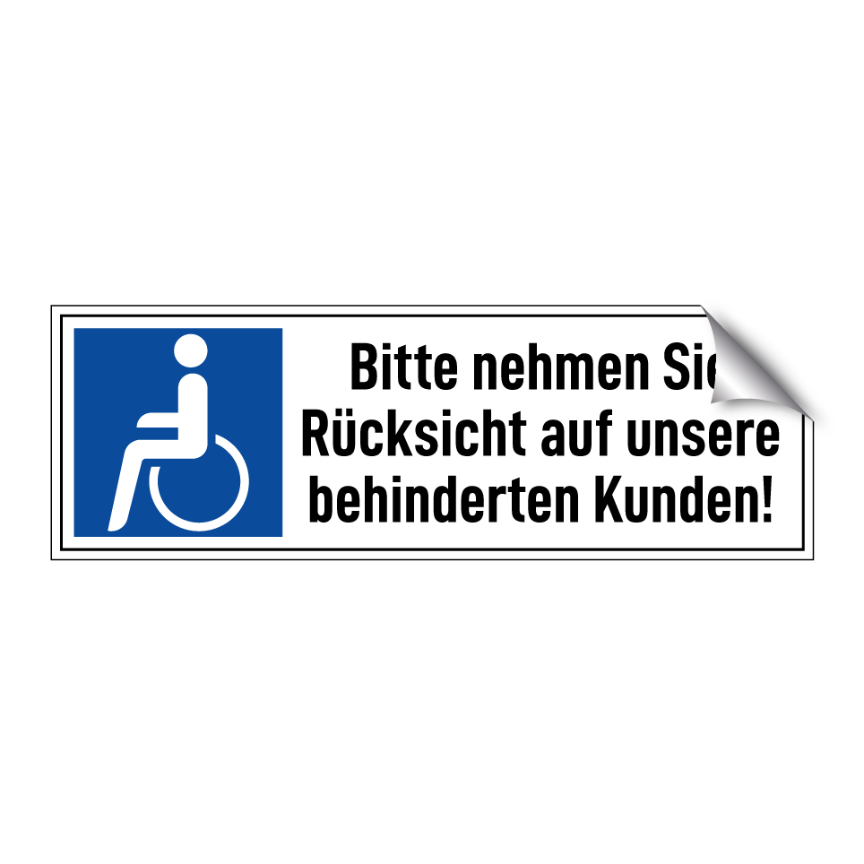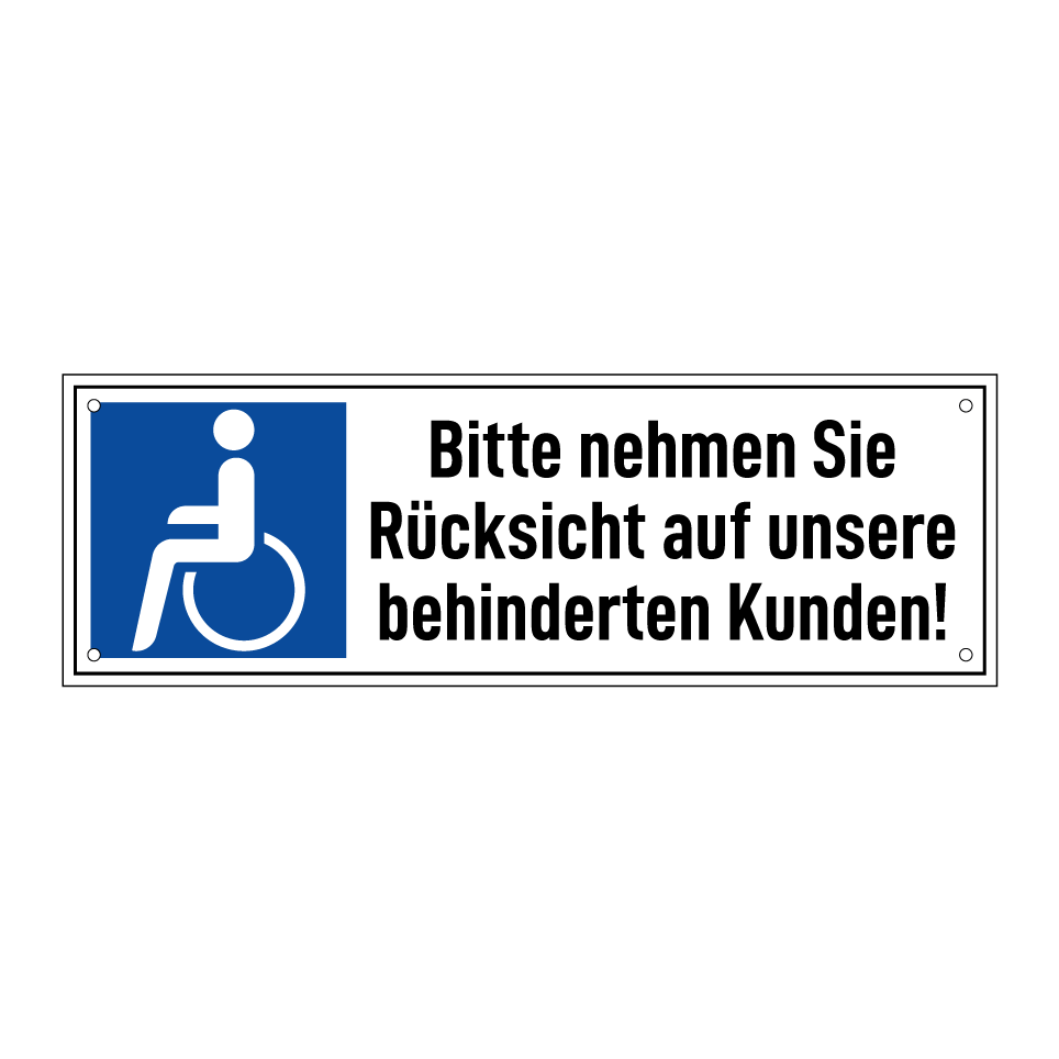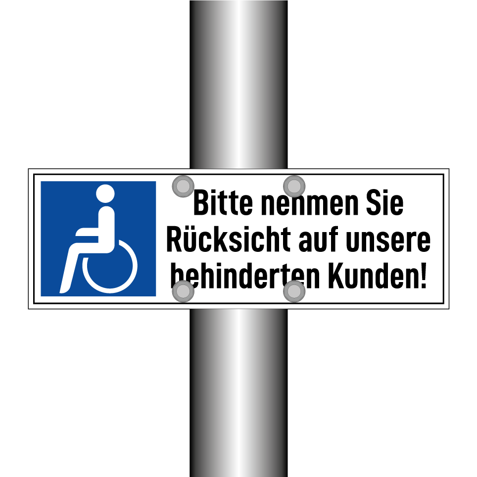 Parkschild mit dem Text Bitte nehmen Sie Rücksicht auf unsere behinderten Kunden!