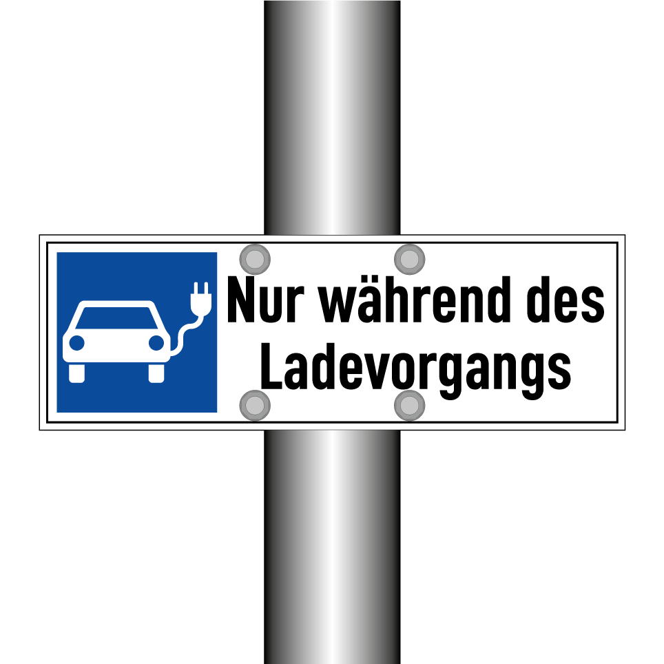 Diese Hinweistafel ist ideal für Parkplätze, die speziell für Elektrofahrzeuge während des Ladevorgangs reserviert sind. Sie kann an Ladestationen, in Tiefgaragen oder auf Firmenparkplätzen angebracht werden, um sicherzustellen, dass die Stellplätze nur von Fahrzeugen genutzt werden, die gerade aufgeladen werden. Die klare Gestaltung mit weißem Hintergrund und schwarzem Rahmen sorgt für hohe Sichtbarkeit und Verständlichkeit. Diese Beschilderung trägt dazu bei, die Nutzung von Ladeplätzen effizient zu regeln und Missverständnisse zu vermeiden.