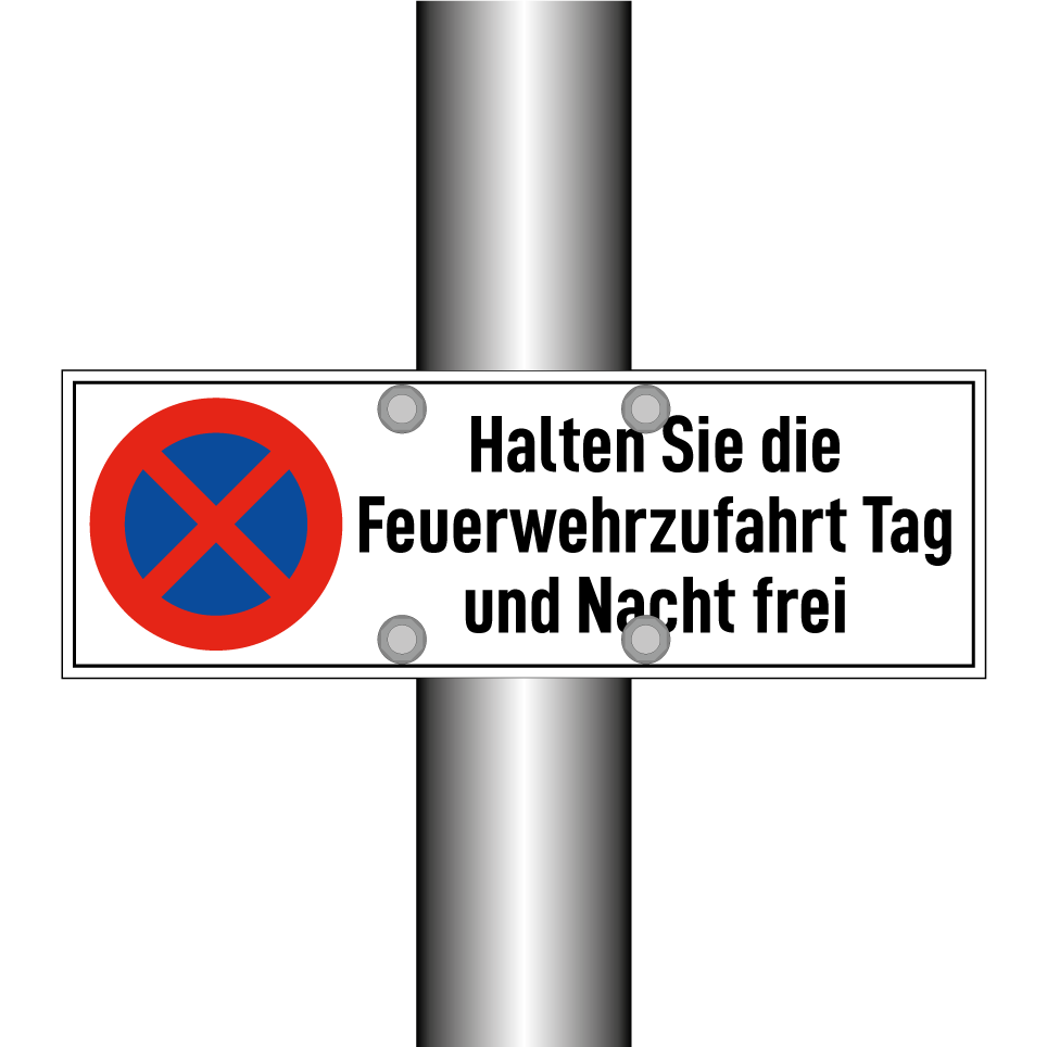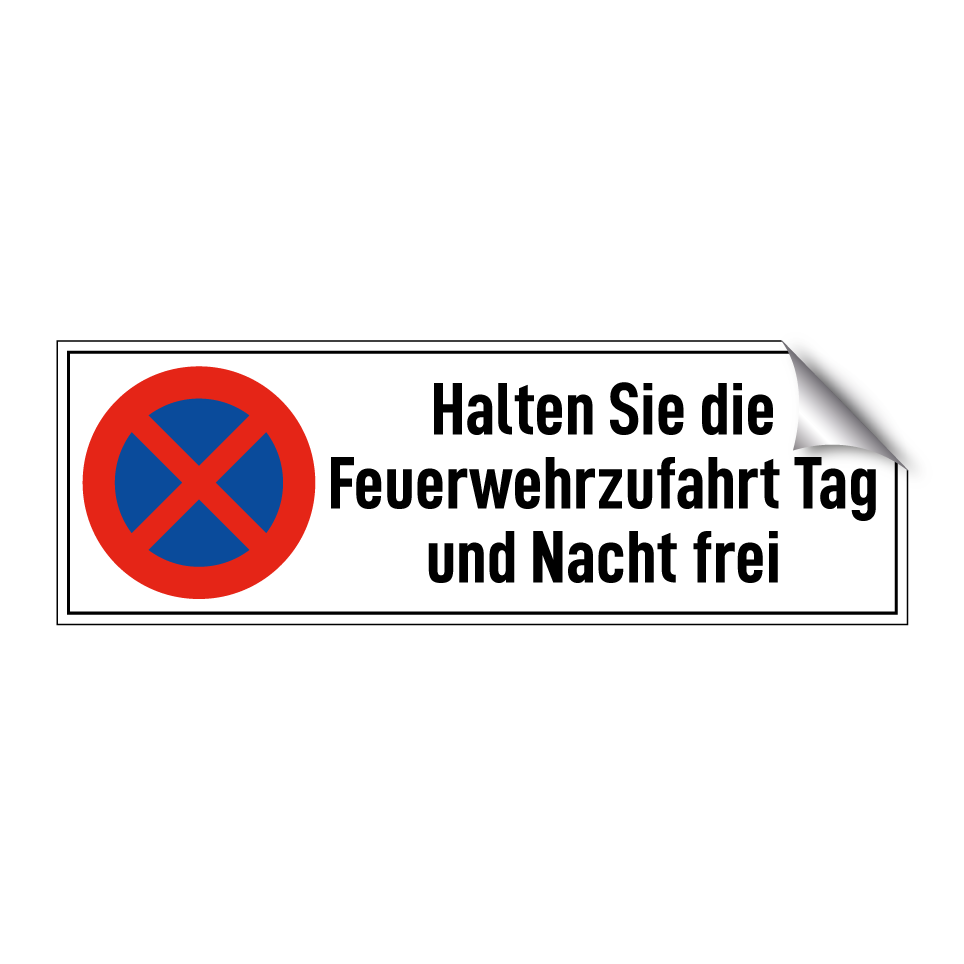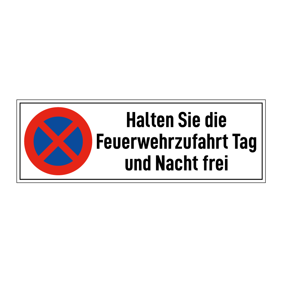 Parkverbotsschild mit dem Text Halten Sie die Feuerwehrzufahrt Tag und Nacht frei
