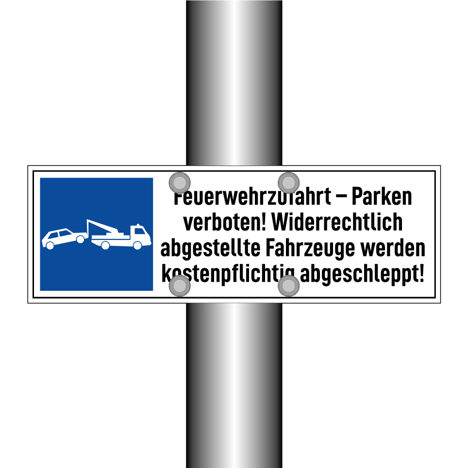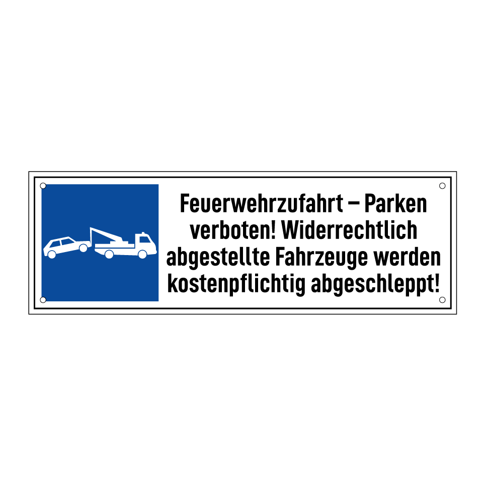 Parkschild mit dem Text Feuerwehrzufahrt – Parken verboten! Widerrechtlich abgestellte Fahrzeuge werden kostenpflichtig abgeschleppt!