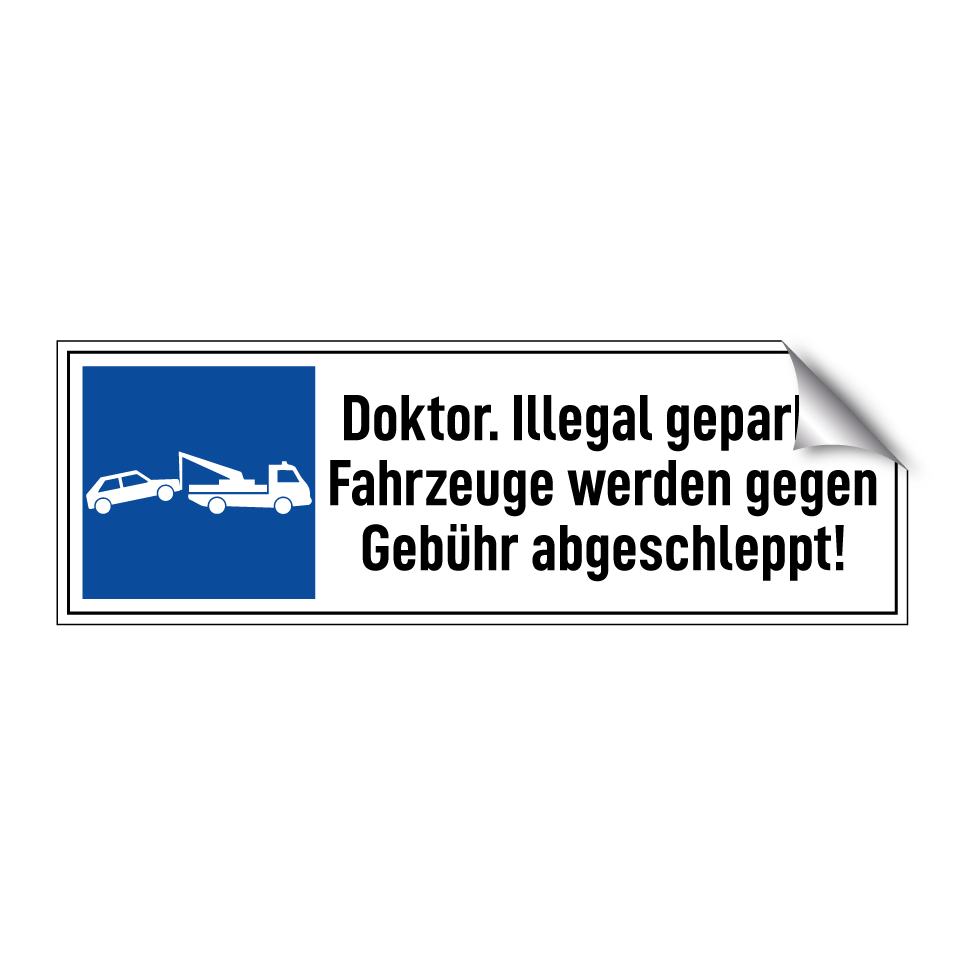 Parkschild mit dem Text Doktor. Illegal geparkte Fahrzeuge werden gegen Gebühr abgeschleppt!