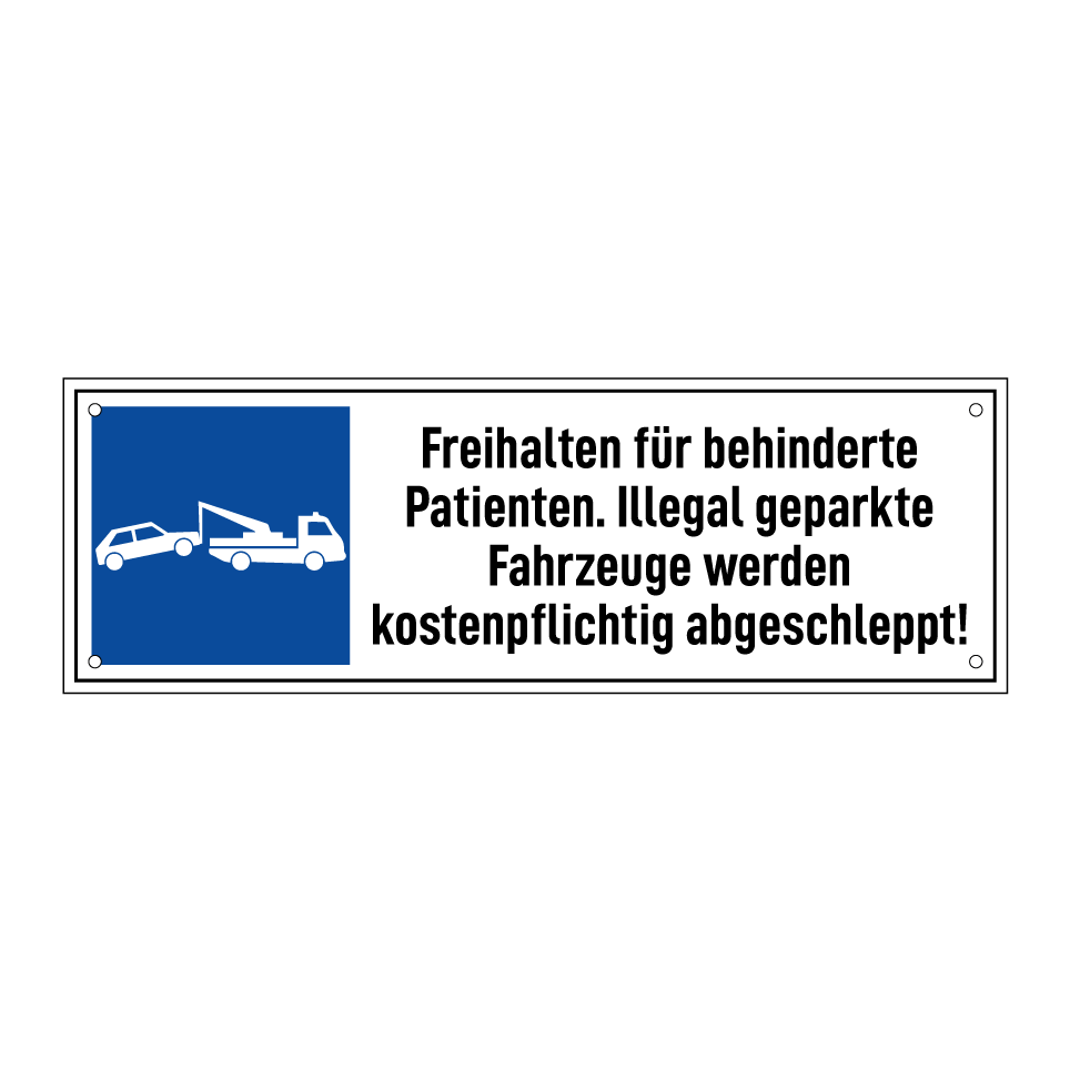 Parkschild mit dem Text Freihalten für behinderte Patienten. Illegal geparkte Fahrzeuge werden kostenpflichtig abgeschleppt!