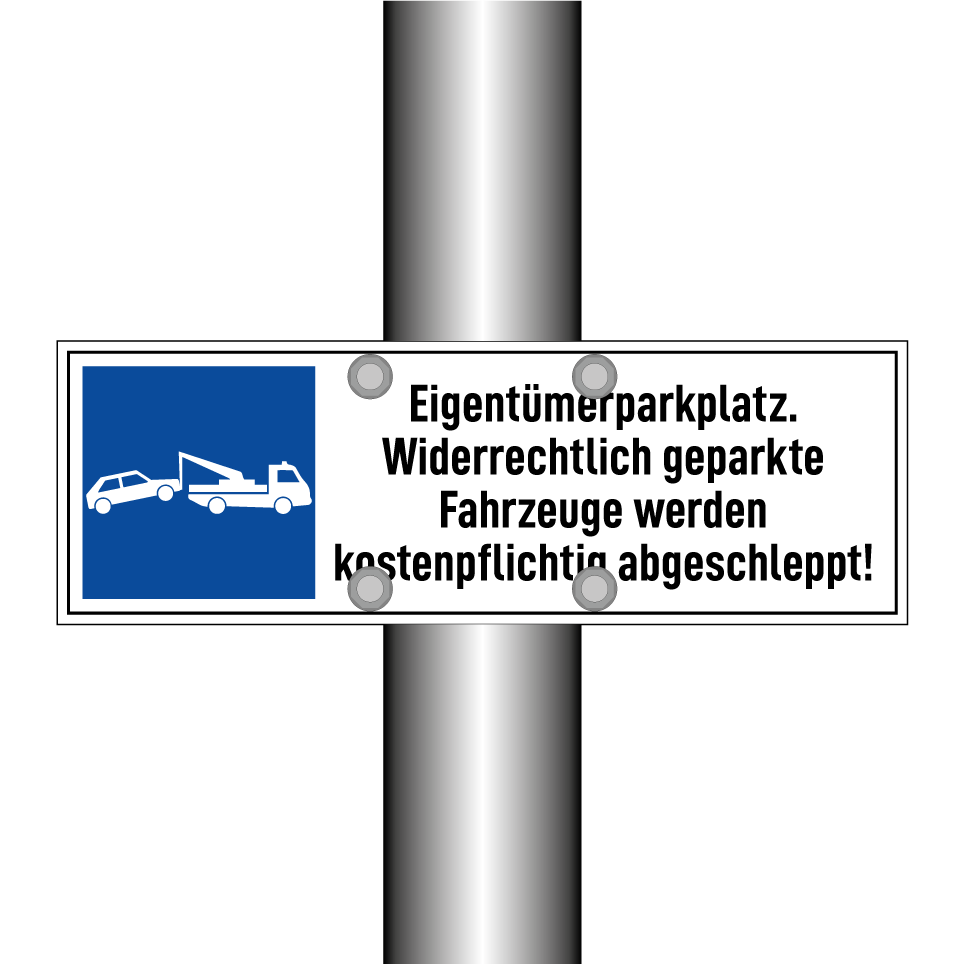Parkschild mit dem Text Eigentümerparkplatz. Widerrechtlich geparkte Fahrzeuge werden kostenpflichtig abgeschleppt!