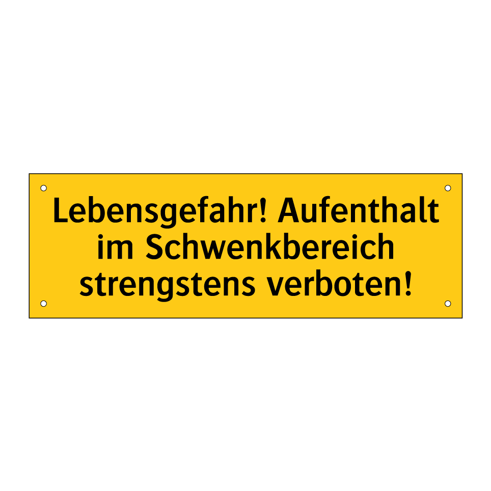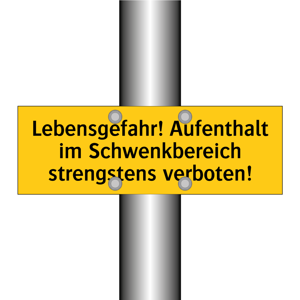Warnschild mit dem Text Lebensgefahr! Aufenthalt im Schwenkbereich strengstens verboten!