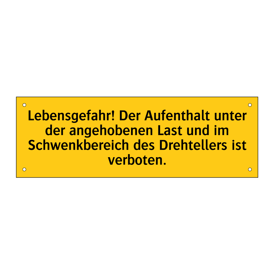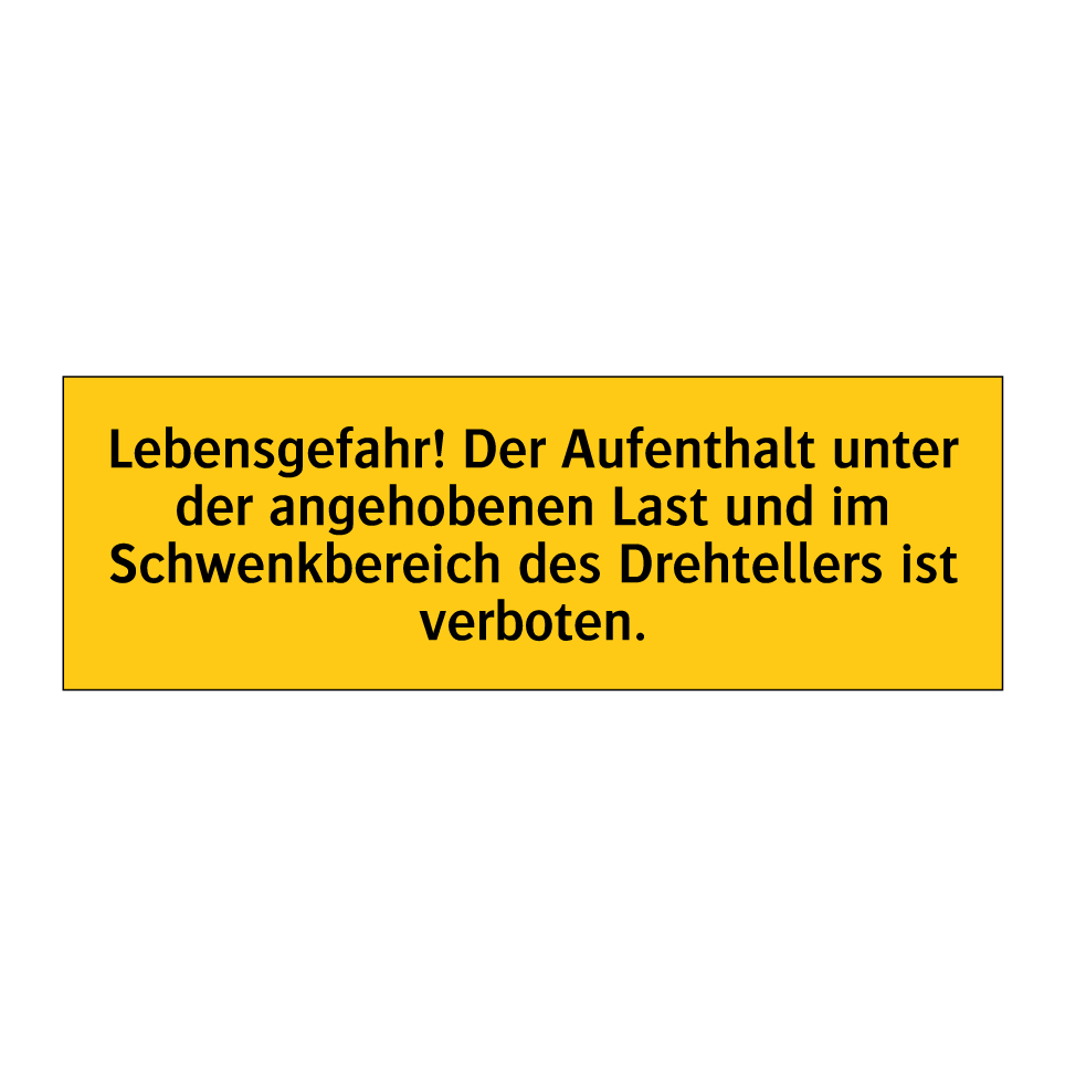 Warnschild mit dem Text Lebensgefahr! Der Aufenthalt unter der angehobenen Last und im Schwenkbereich des Drehtellers ist verboten.