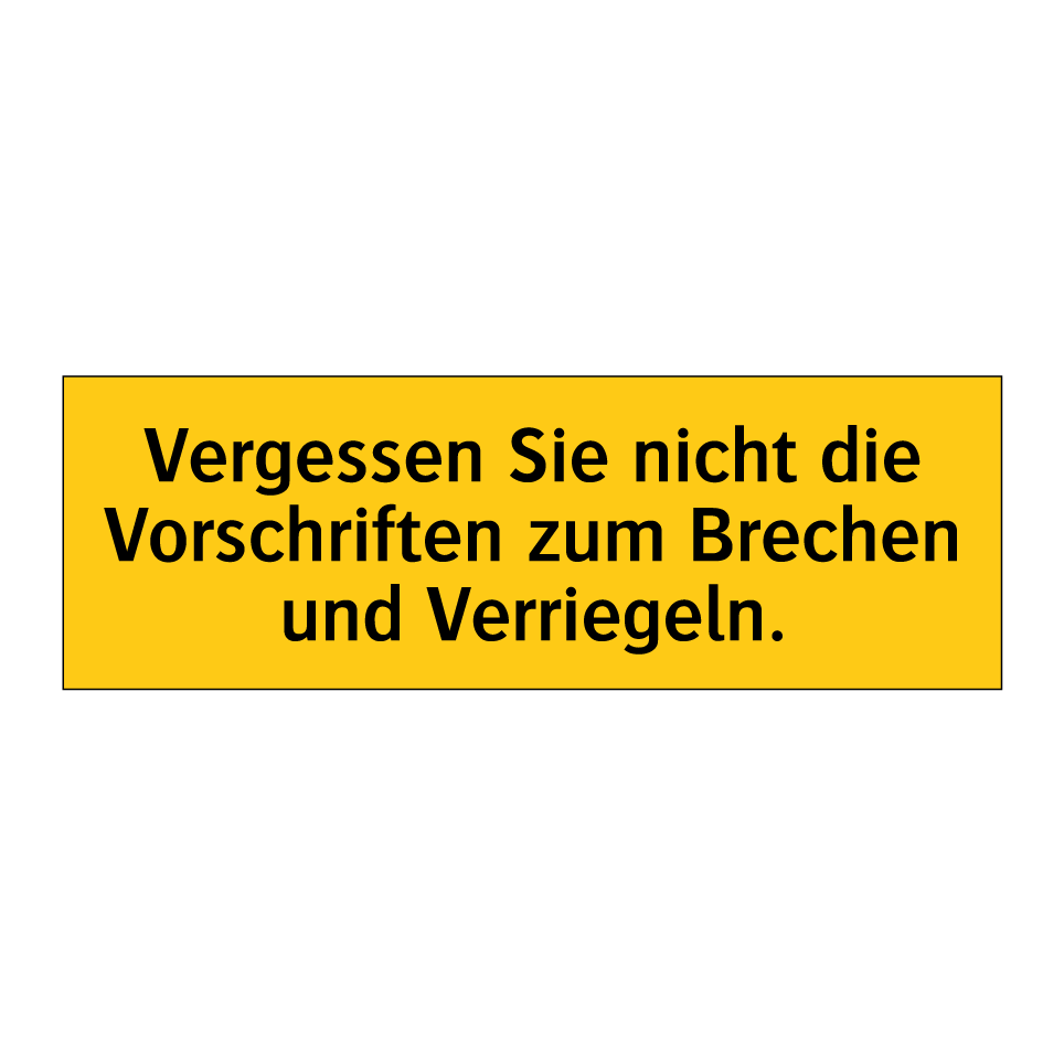 Warnschild mit dem Text Vergessen Sie nicht die Vorschriften zum Brechen und Verriegeln.