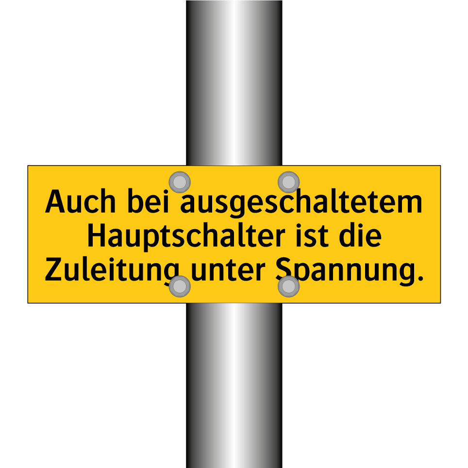 Warnschild mit dem Text Auch bei ausgeschaltetem Hauptschalter ist die Zuleitung unter Spannung.