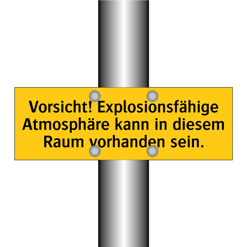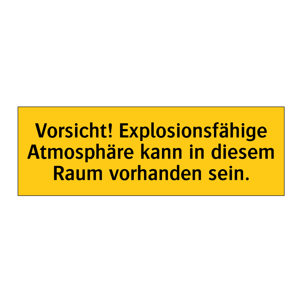 Warnschild mit dem Text Vorsicht! Explosionsfähige Atmosphäre kann in diesem Raum vorhanden sein.