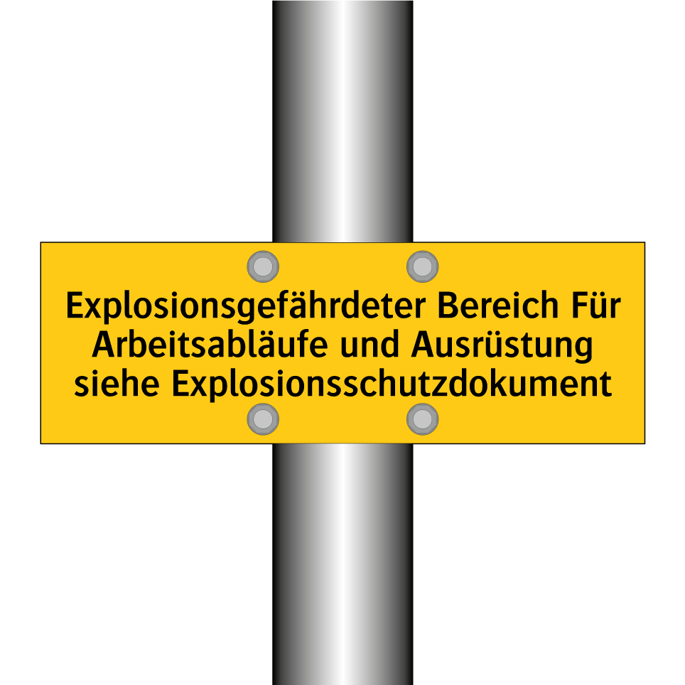 Warnschild mit dem Text Explosionsgefährdeter Bereich Für Arbeitsabläufe und Ausrüstung siehe Explosionsschutzdokument