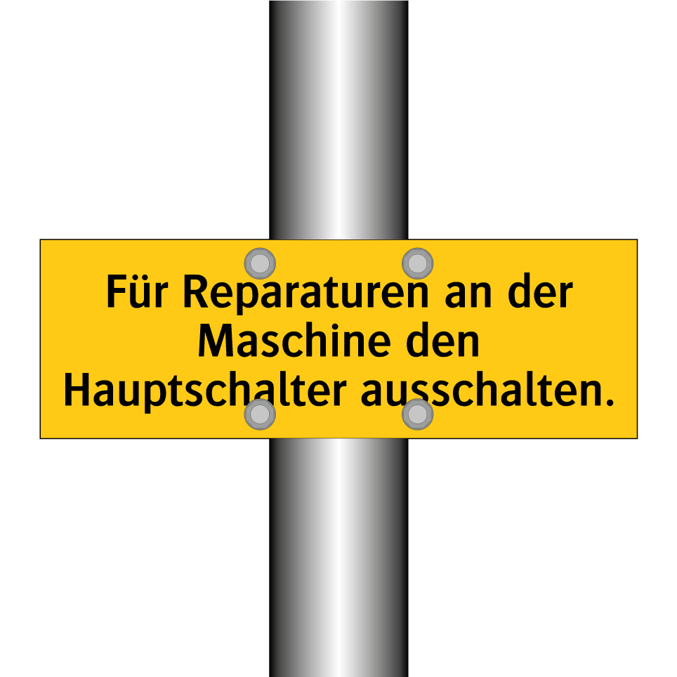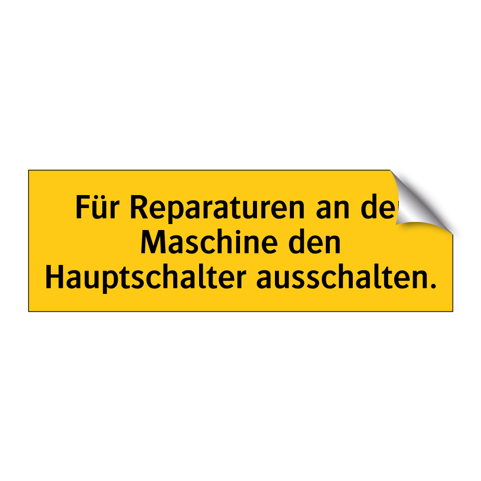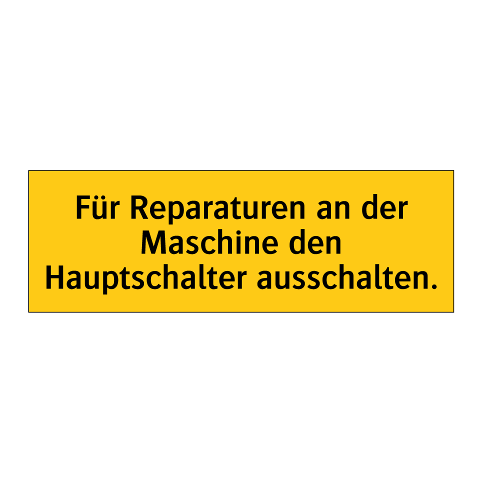Warnschild mit dem Text Für Reparaturen an der Maschine den Hauptschalter ausschalten.