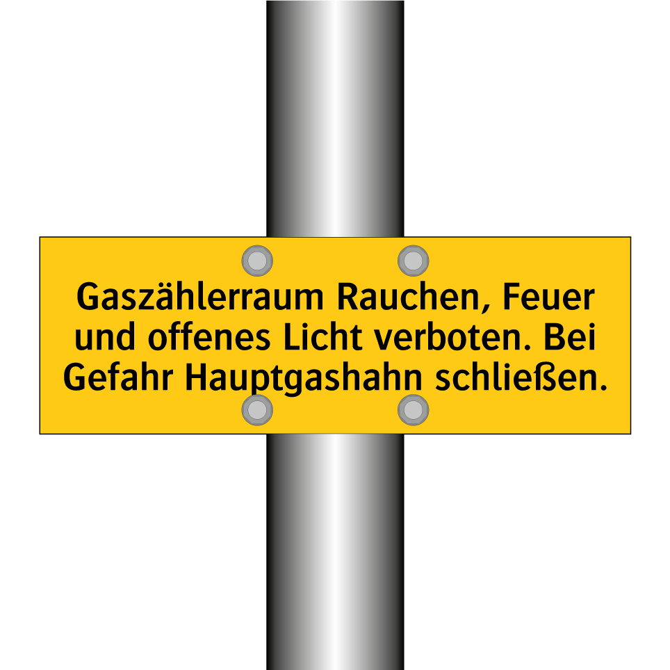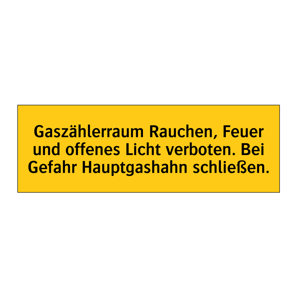 Warnschild mit dem Text Gaszählerraum Rauchen, Feuer und offenes Licht verboten. Bei Gefahr Hauptgashahn schließen.
