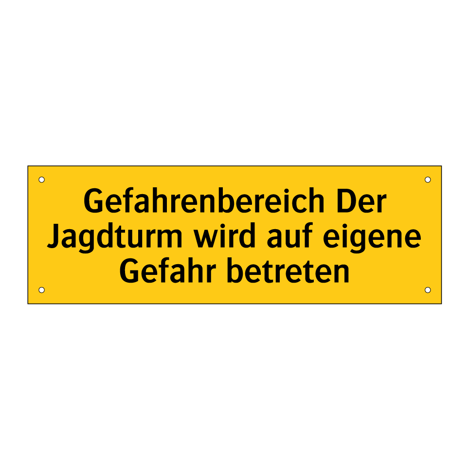 Warnschild mit dem Text Gefahrenbereich Der Jagdturm wird auf eigene Gefahr betreten