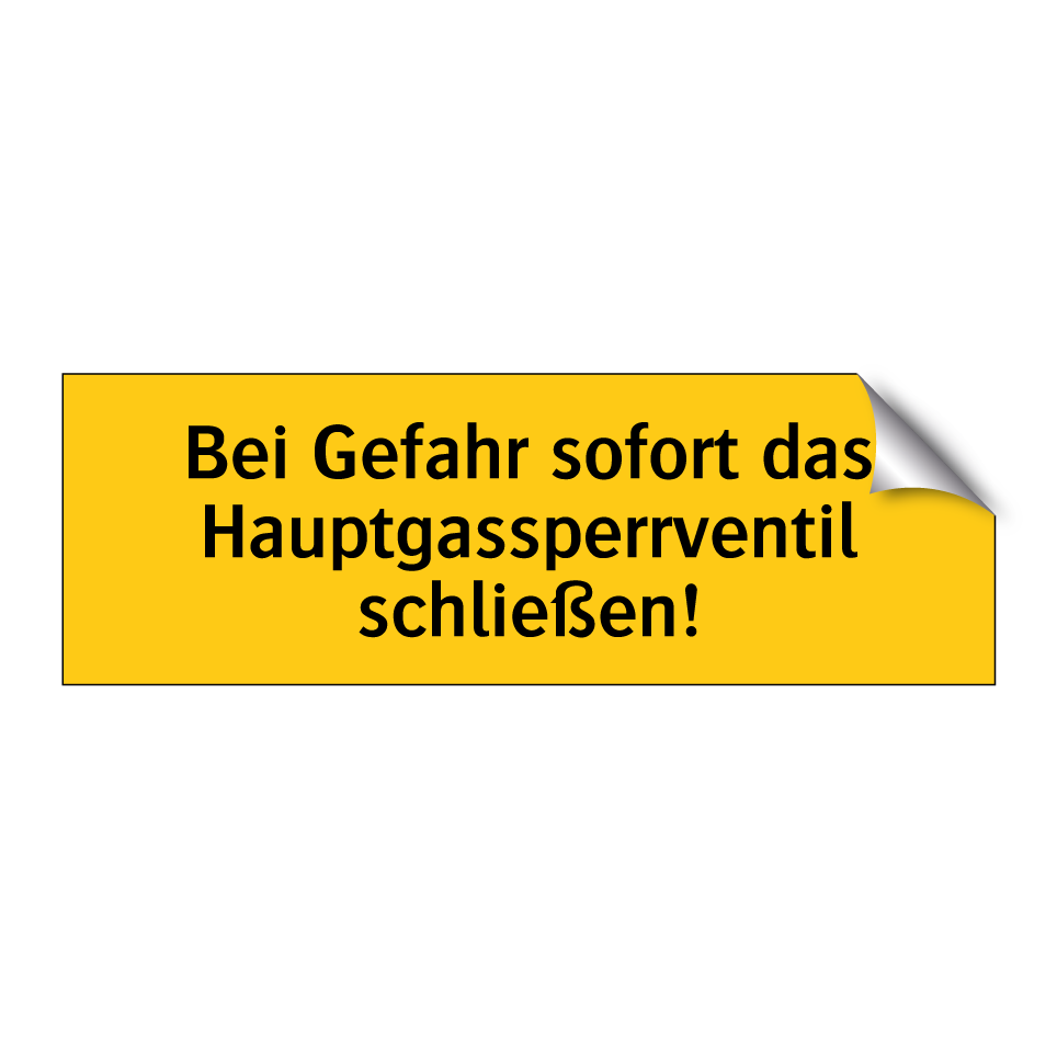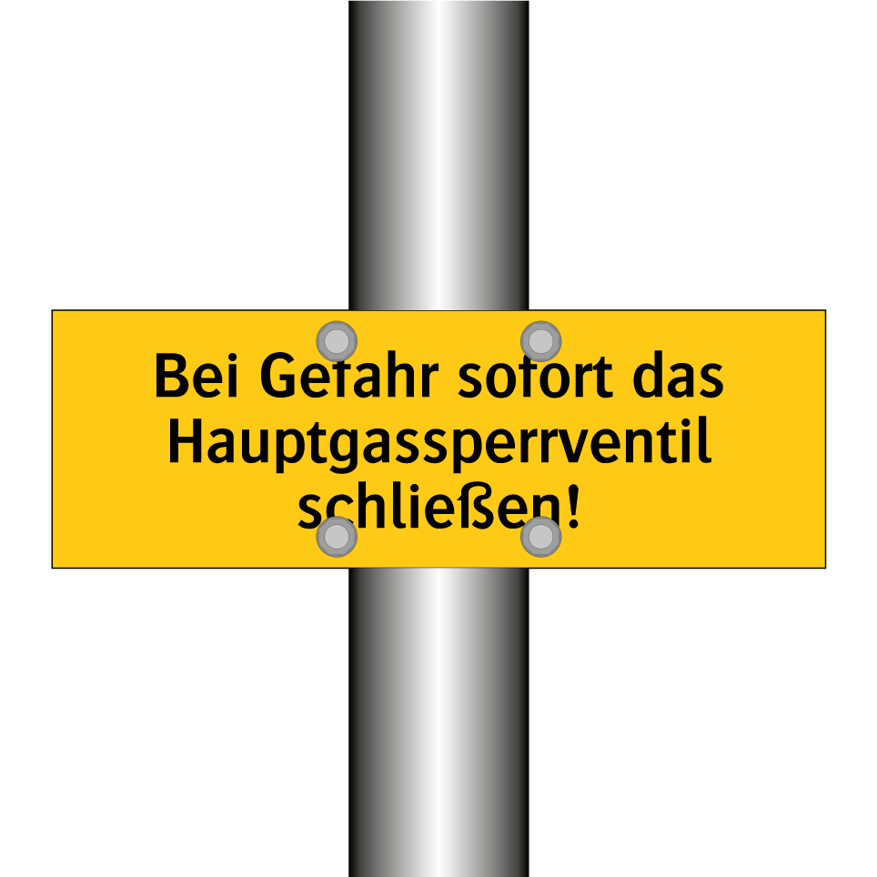 Warnschild mit dem Text Bei Gefahr sofort das Hauptgassperrventil schließen!