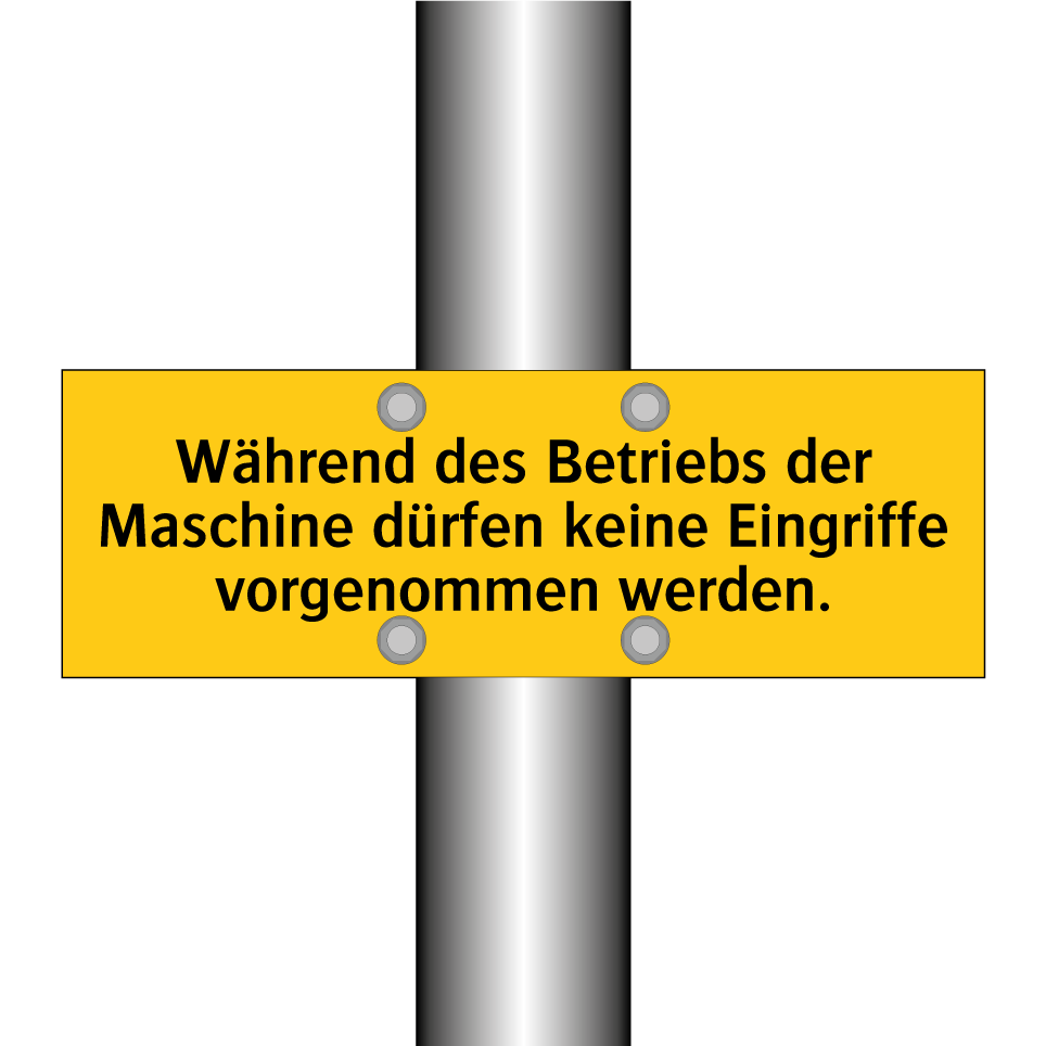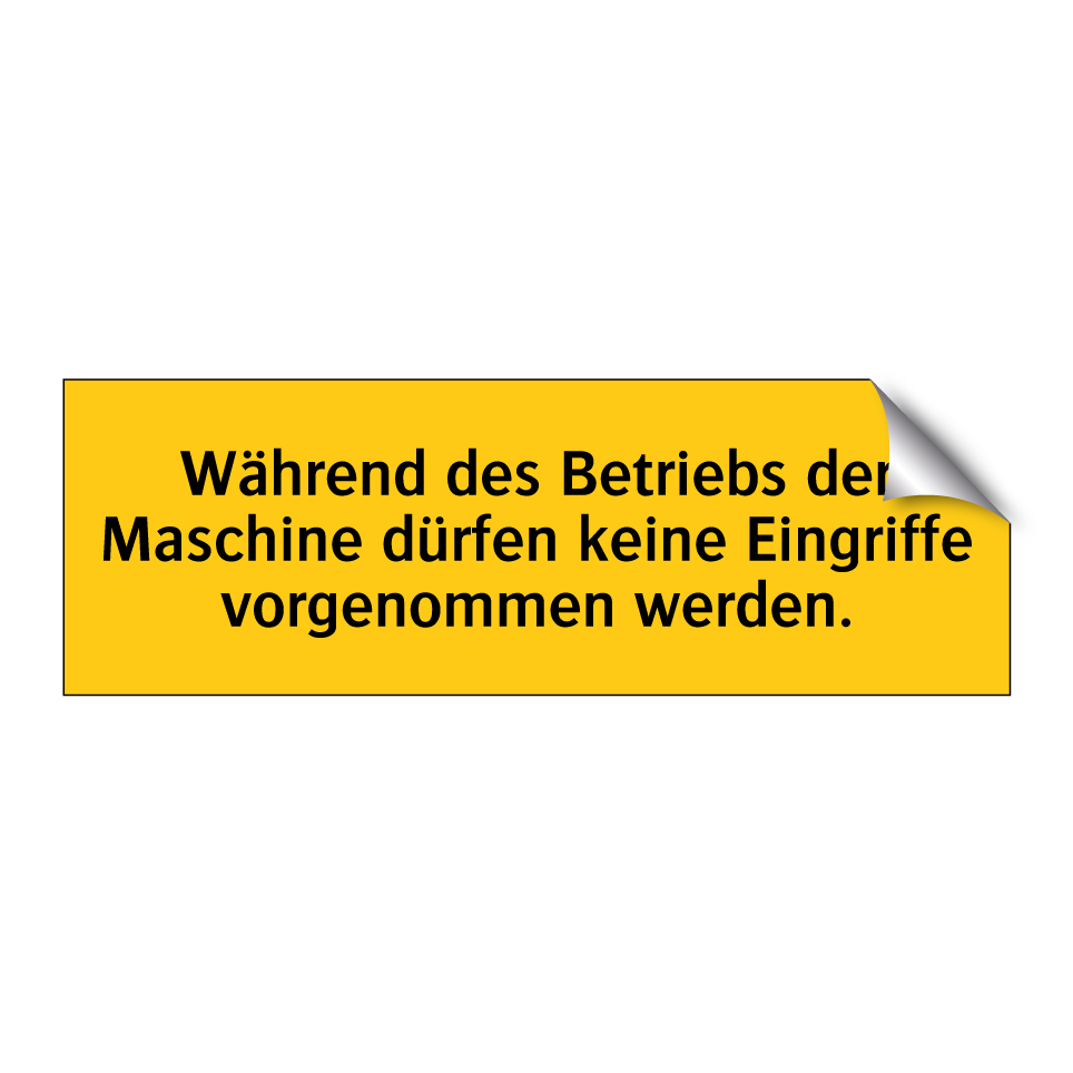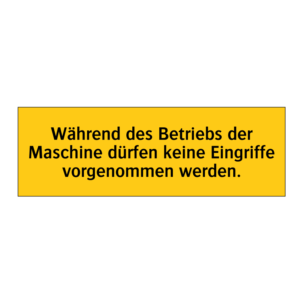 Warnschild mit dem Text Während des Betriebs der Maschine dürfen keine Eingriffe vorgenommen werden.
