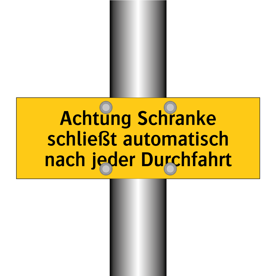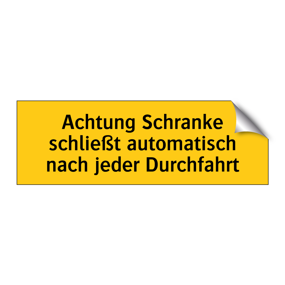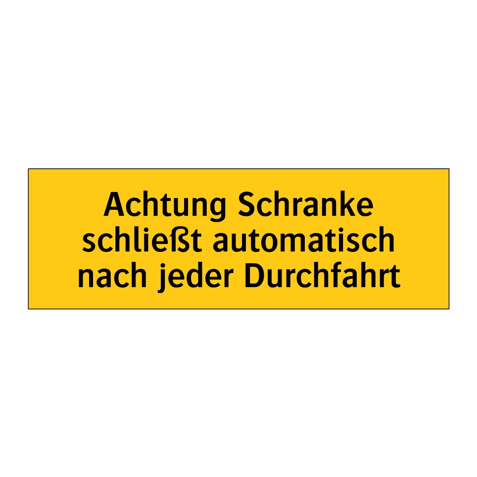 Warnschild mit dem Text Achtung Schranke schließt automatisch nach jeder Durchfahrt