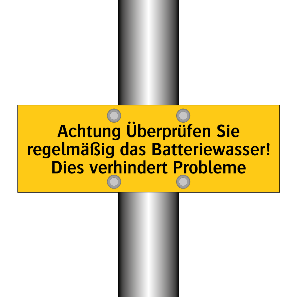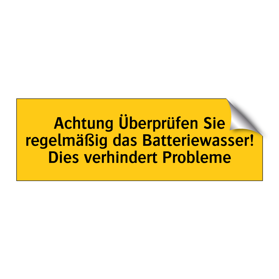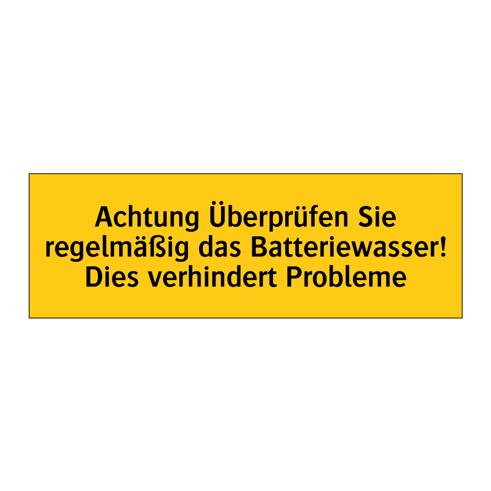 Warnschild mit dem Text Achtung Überprüfen Sie regelmäßig das Batteriewasser! Dies verhindert Probleme