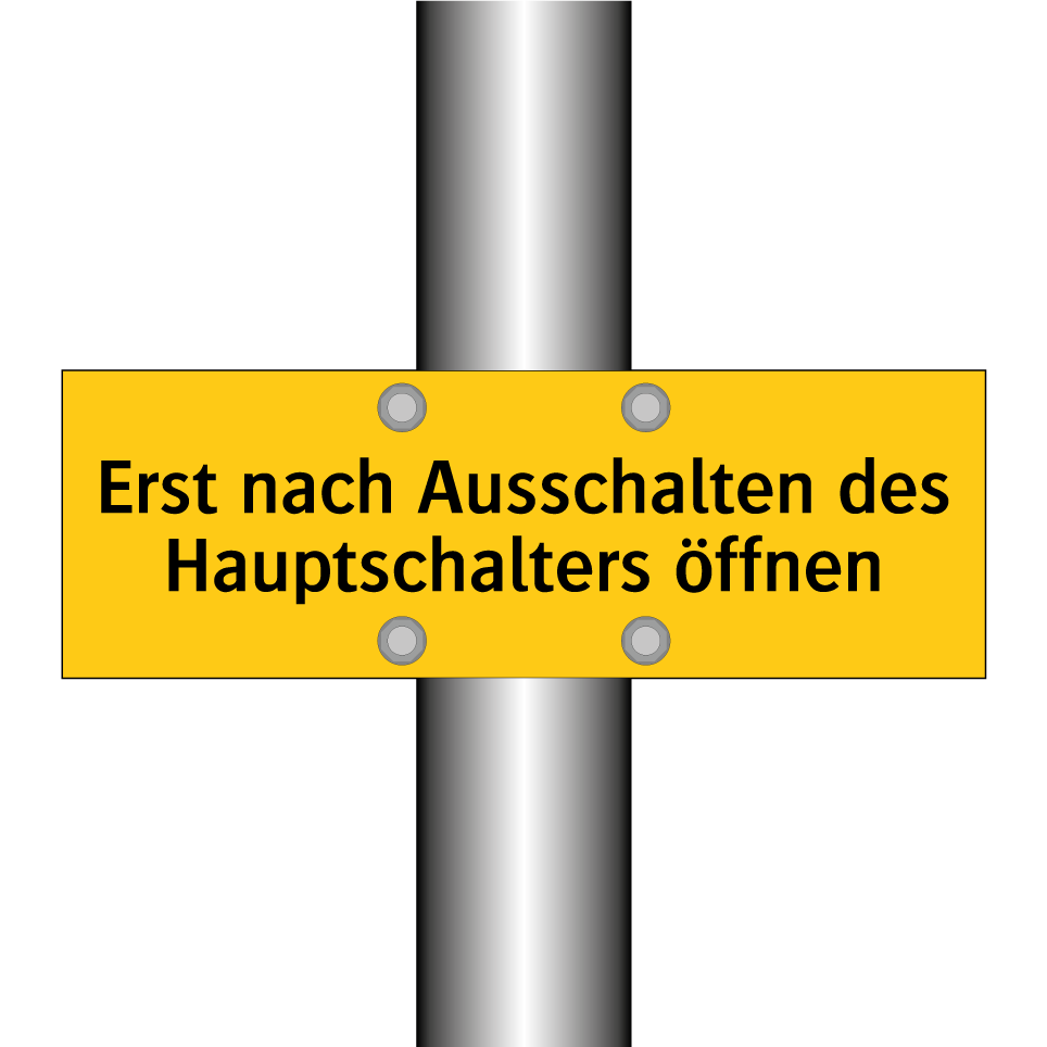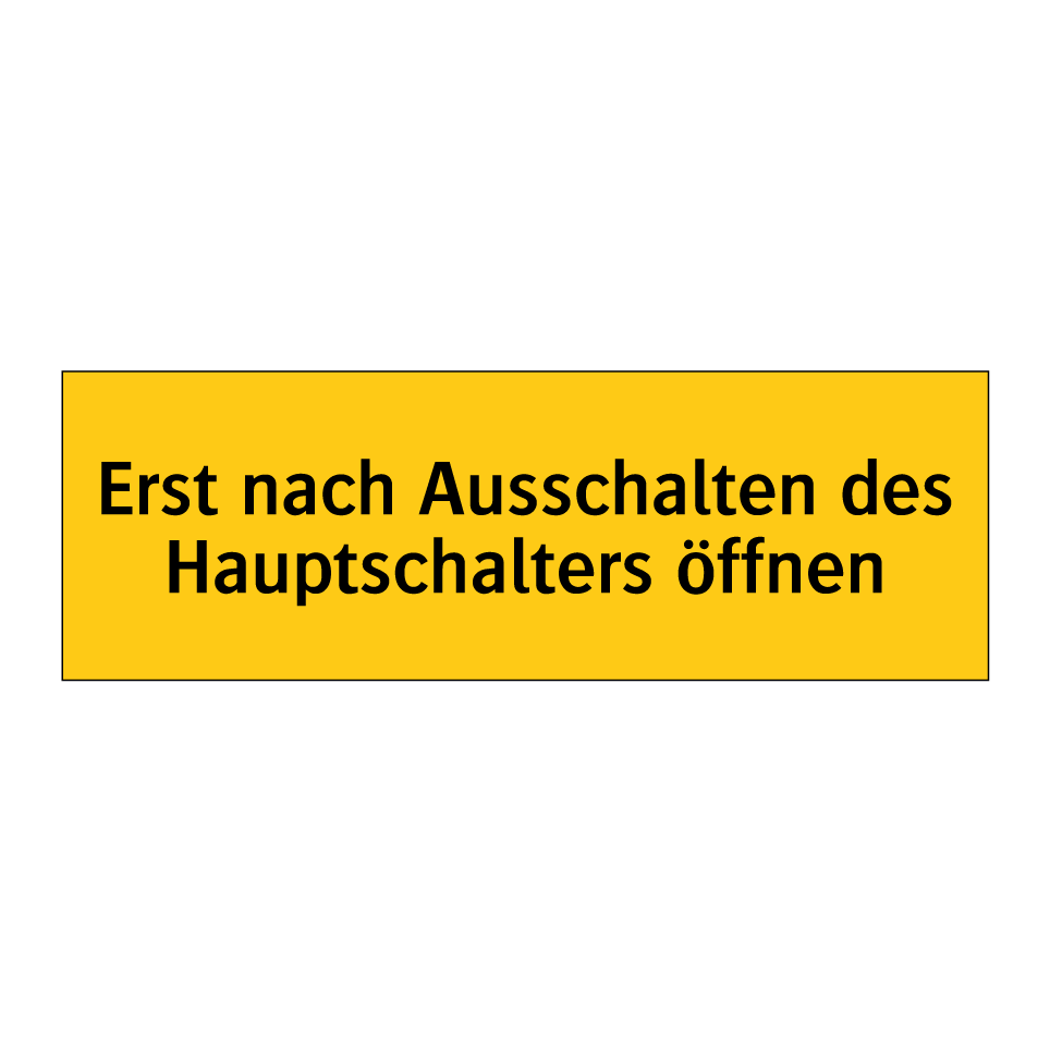 Warnschild mit dem Text Erst nach Ausschalten des Hauptschalters öffnen