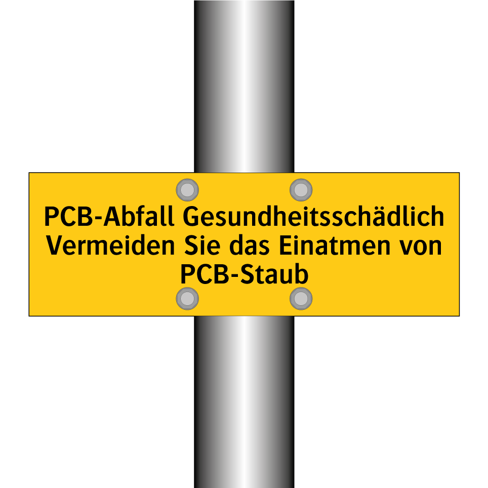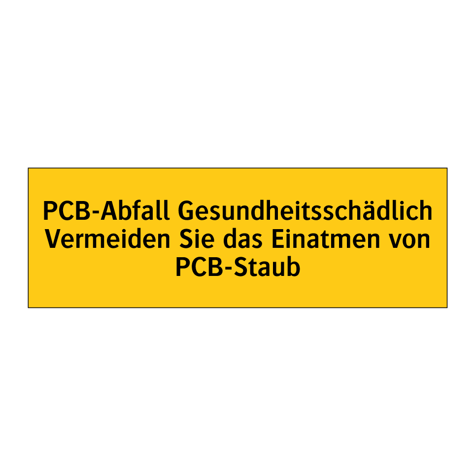 Warnschild mit dem Text PCB-Abfall Gesundheitsschädlich Vermeiden Sie das Einatmen von PCB-Staub
