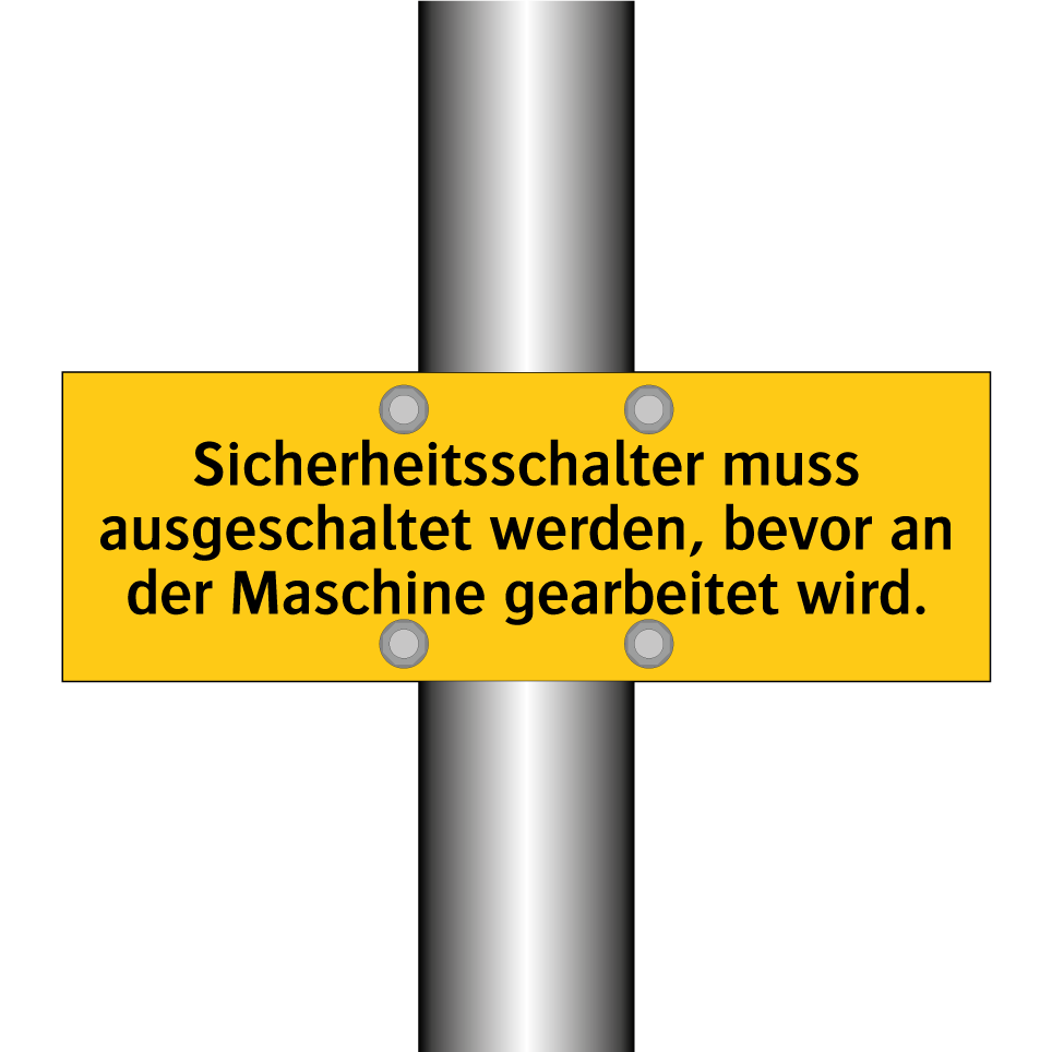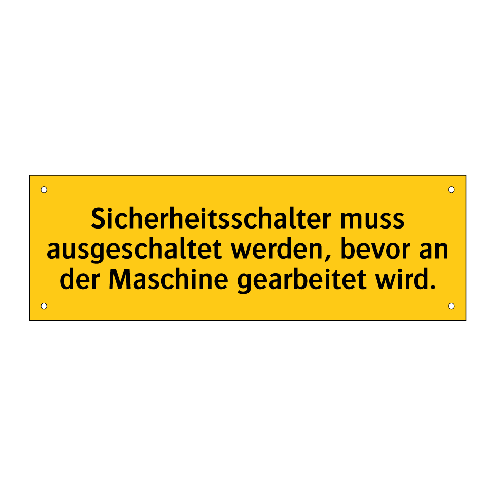 Warnschild mit dem Text Sicherheitsschalter muss ausgeschaltet werden, bevor an der Maschine gearbeitet wird.
