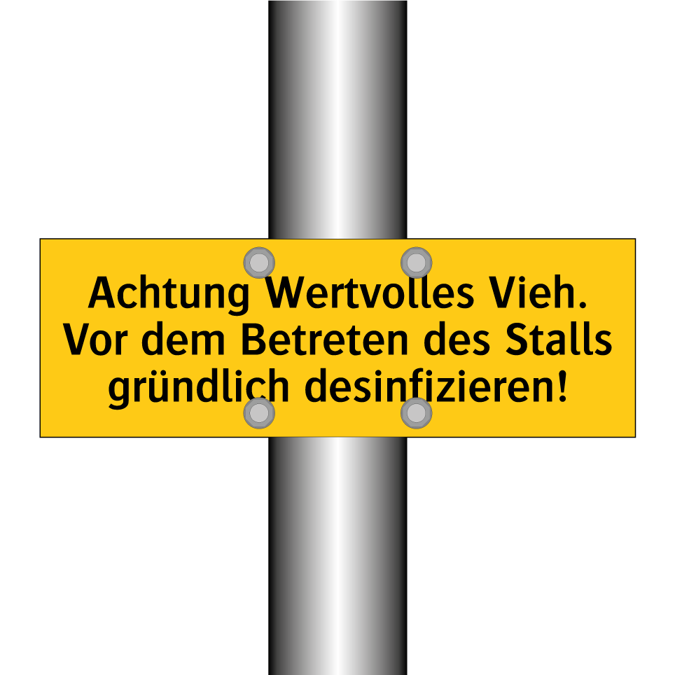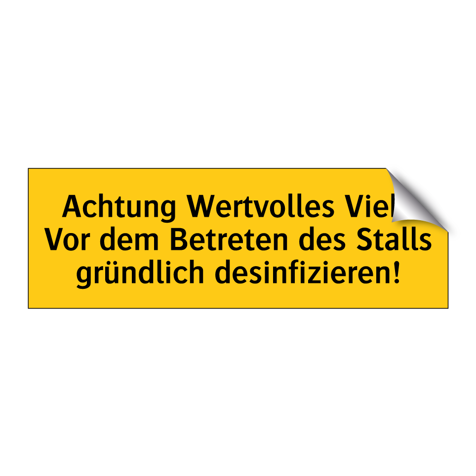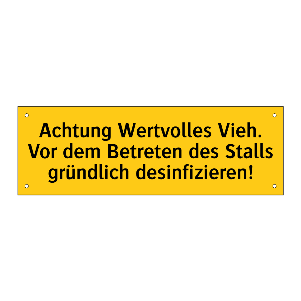 Warnschild mit dem Text Achtung Wertvolles Vieh. Vor dem Betreten des Stalls gründlich desinfizieren!