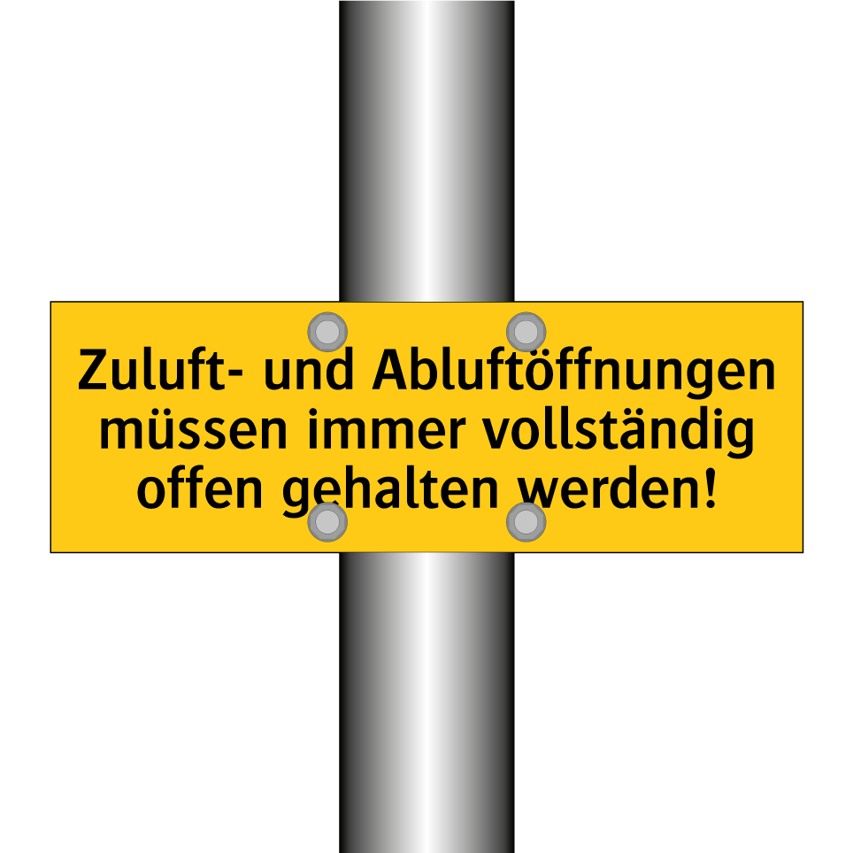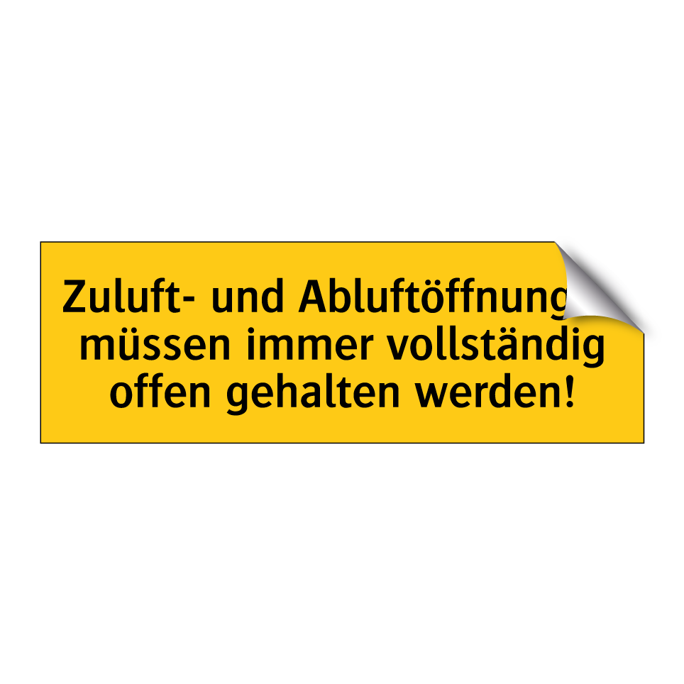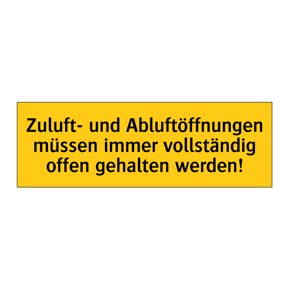 Warnschild mit dem Text Zuluft- und Abluftöffnungen müssen immer vollständig offen gehalten werden!