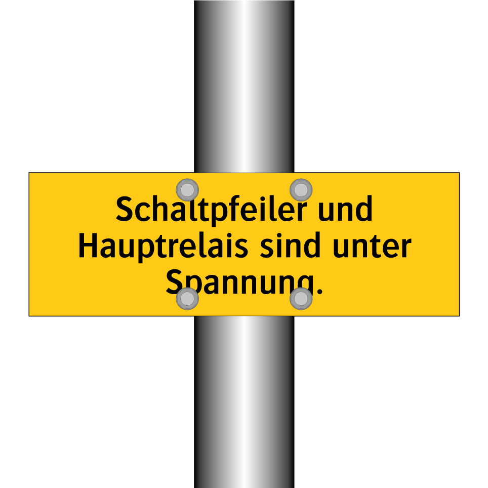 Warnschild mit dem Text Schaltpfeiler und Hauptrelais sind unter Spannung.