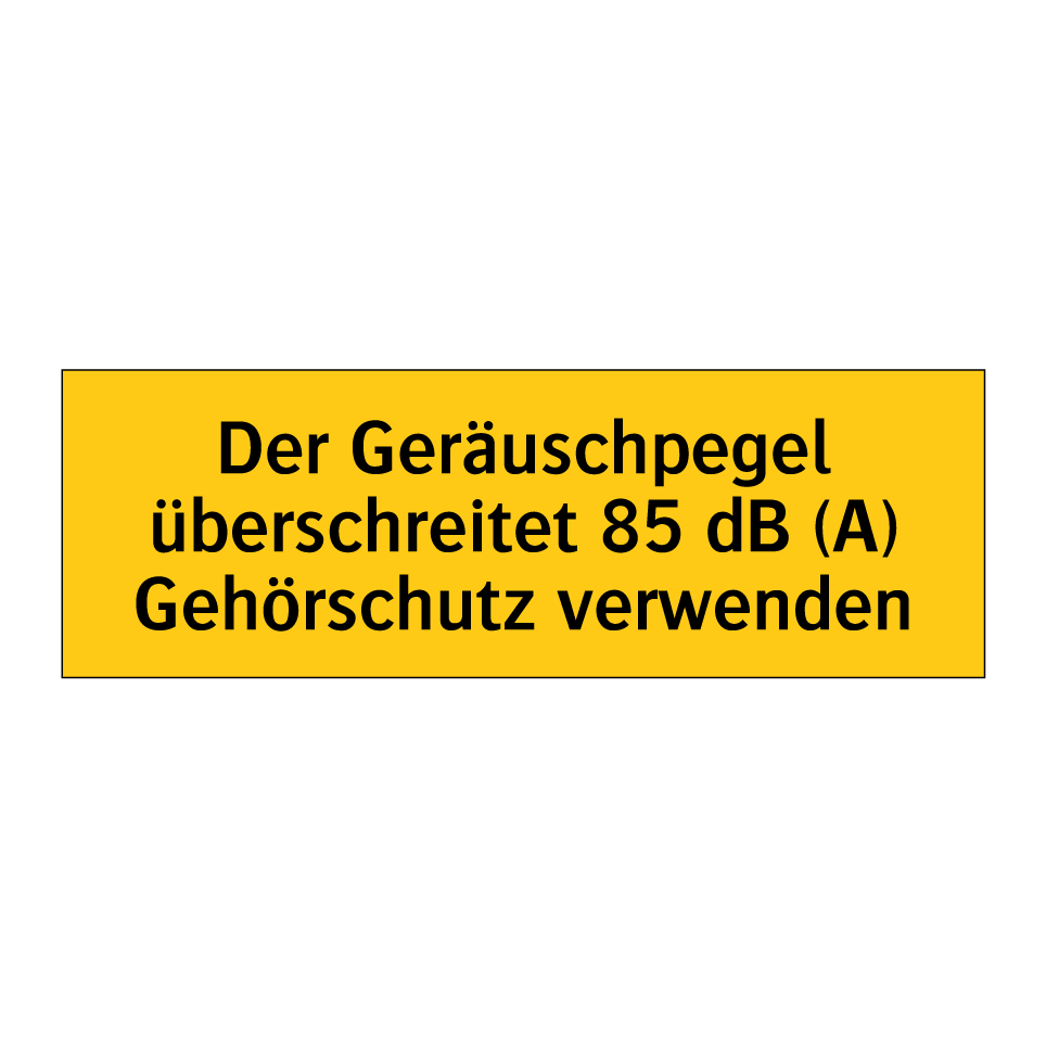 Warnschild mit dem Text Der Geräuschpegel überschreitet 85 dB (A) Gehörschutz verwenden