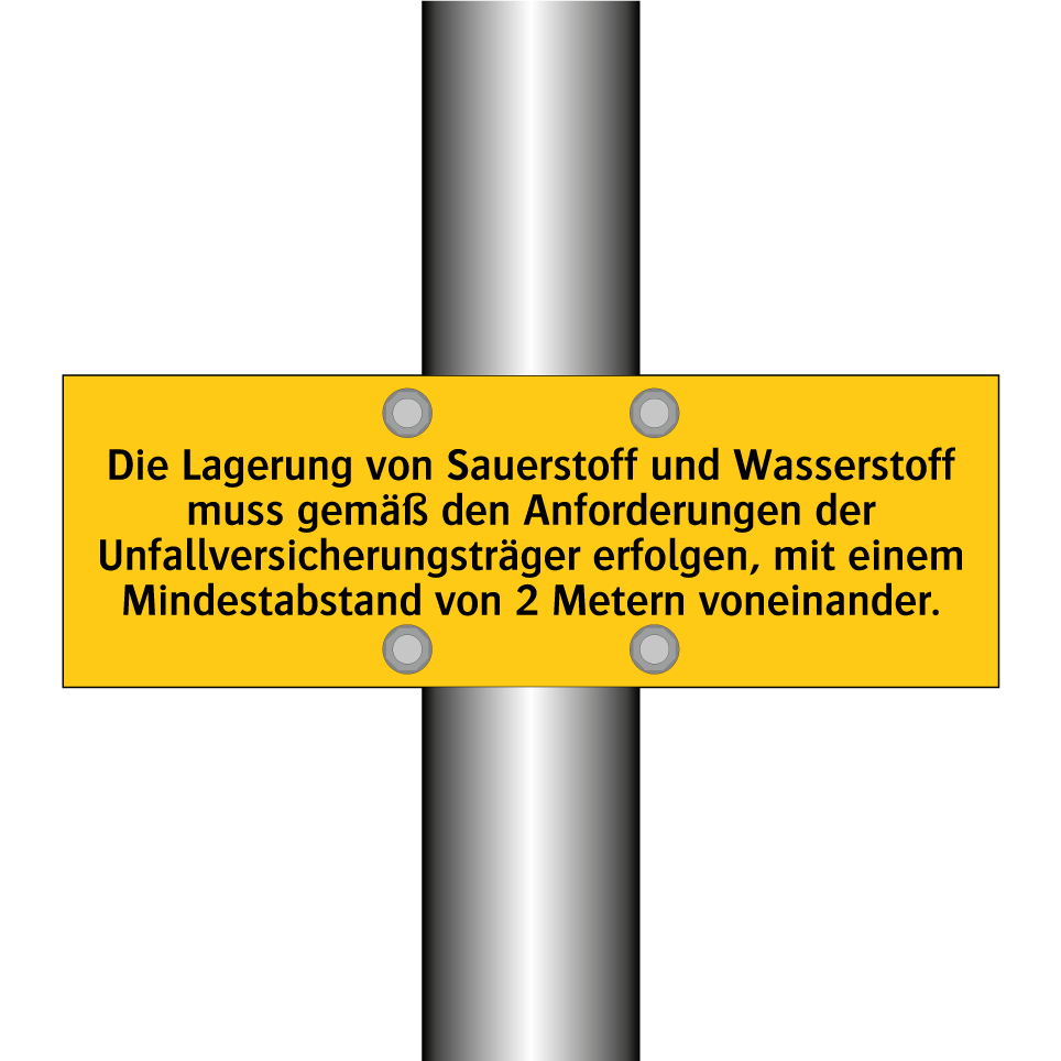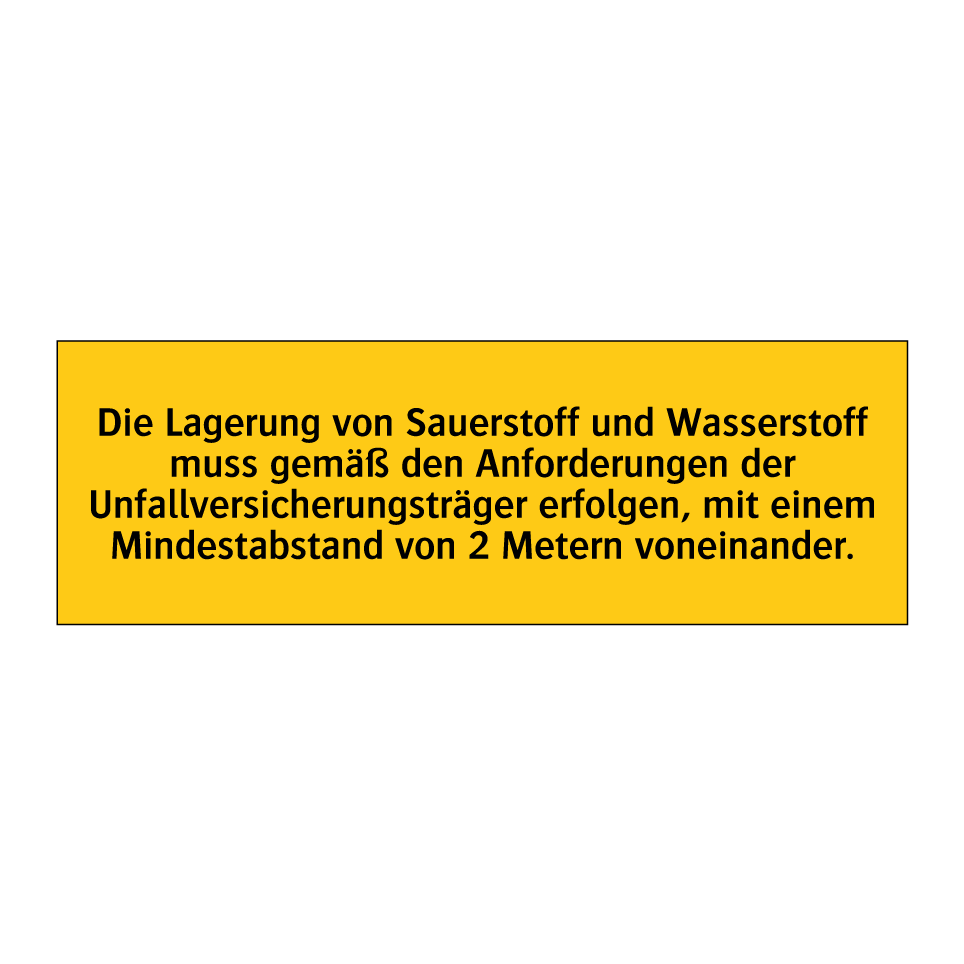 Warnschild mit dem Text Die Lagerung von Sauerstoff und Wasserstoff muss gemäß den Anforderungen der Unfallversicherungsträger erfolgen, mit einem Mindestabstand von 2 Metern voneinander.