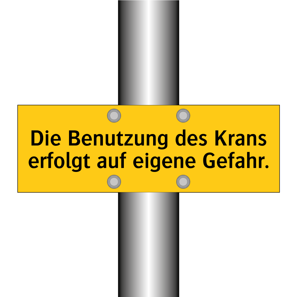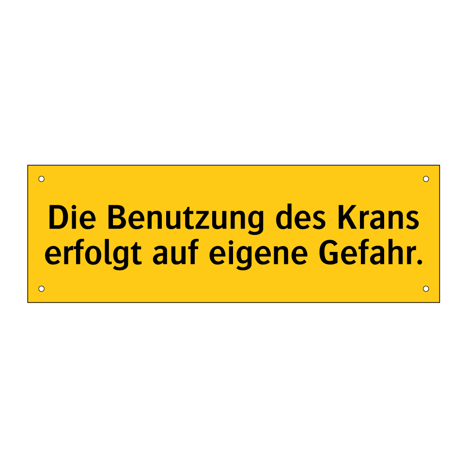 Warnschild mit dem Text Die Benutzung des Krans erfolgt auf eigene Gefahr.