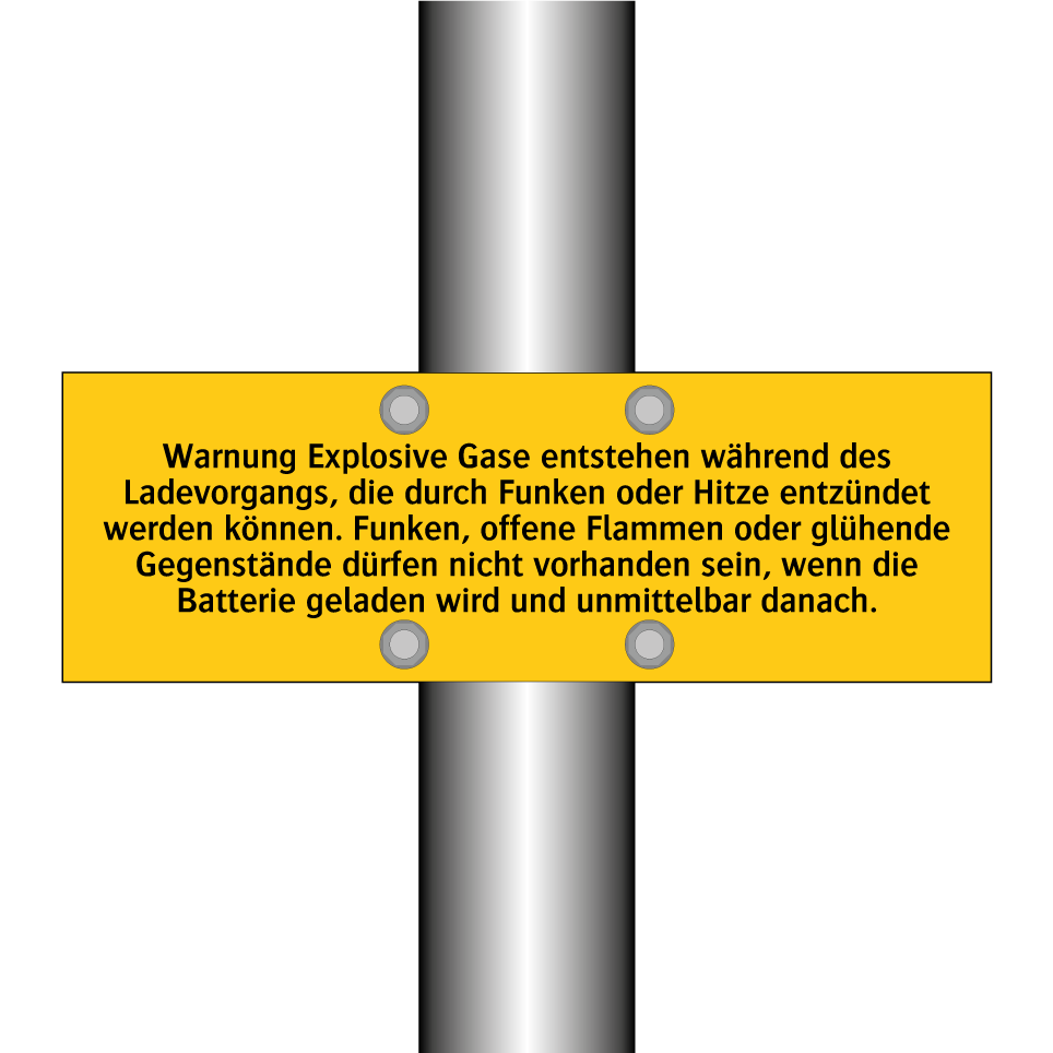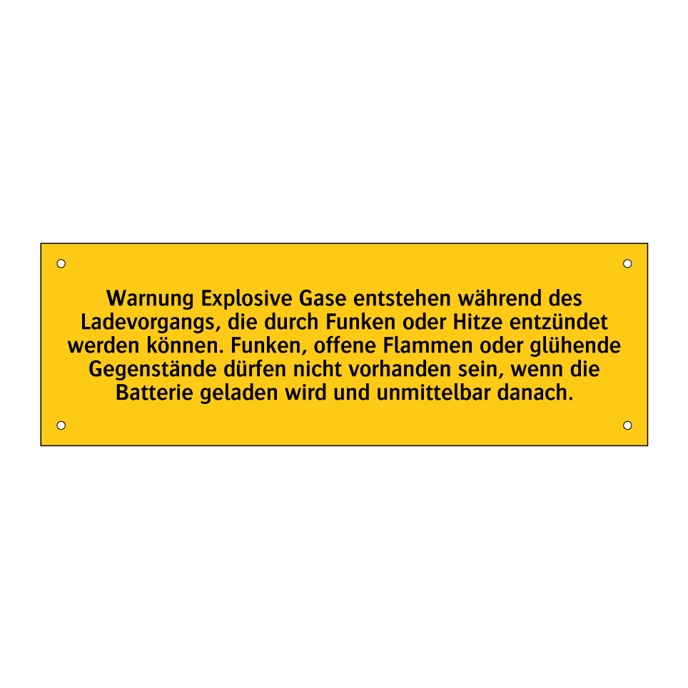 Warnschild mit dem Text Warnung Explosive Gase entstehen während des Ladevorgangs, die durch Funken oder Hitze entzündet werden können. Funken, offene Flammen oder glühende Gegenstände dürfen nicht vorhanden sein, wenn die Batterie geladen wird und unmittelbar danach.