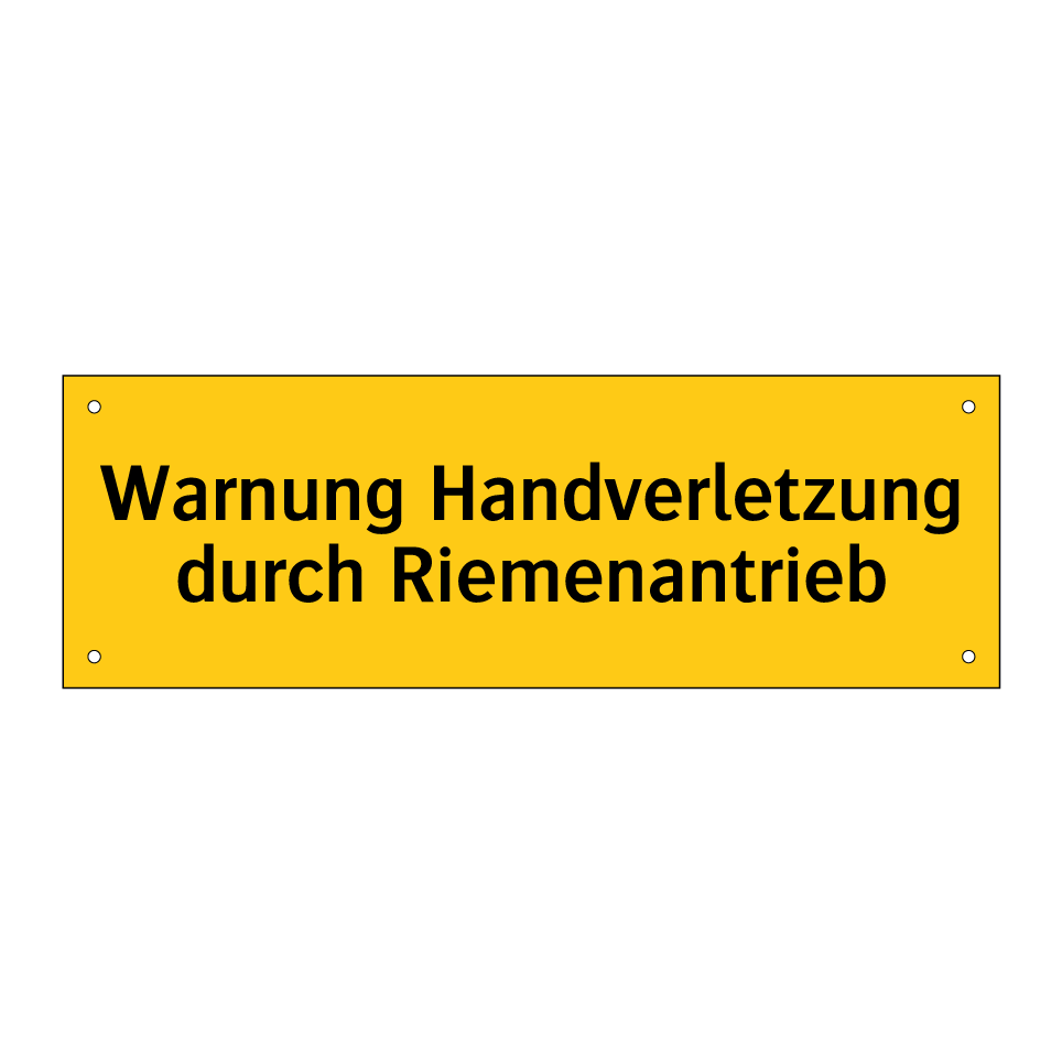 Warnschild mit dem Text Warnung Handverletzung durch Riemenantrieb