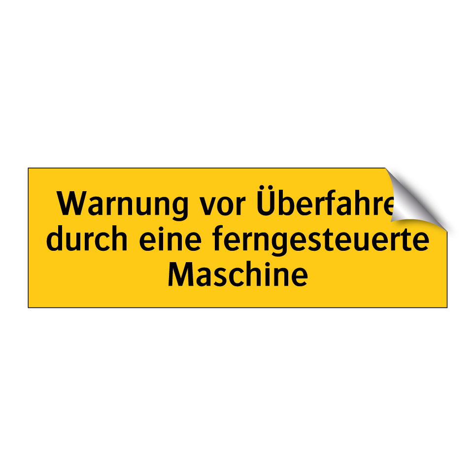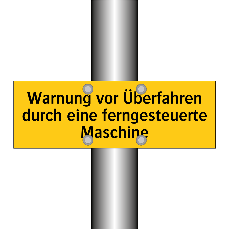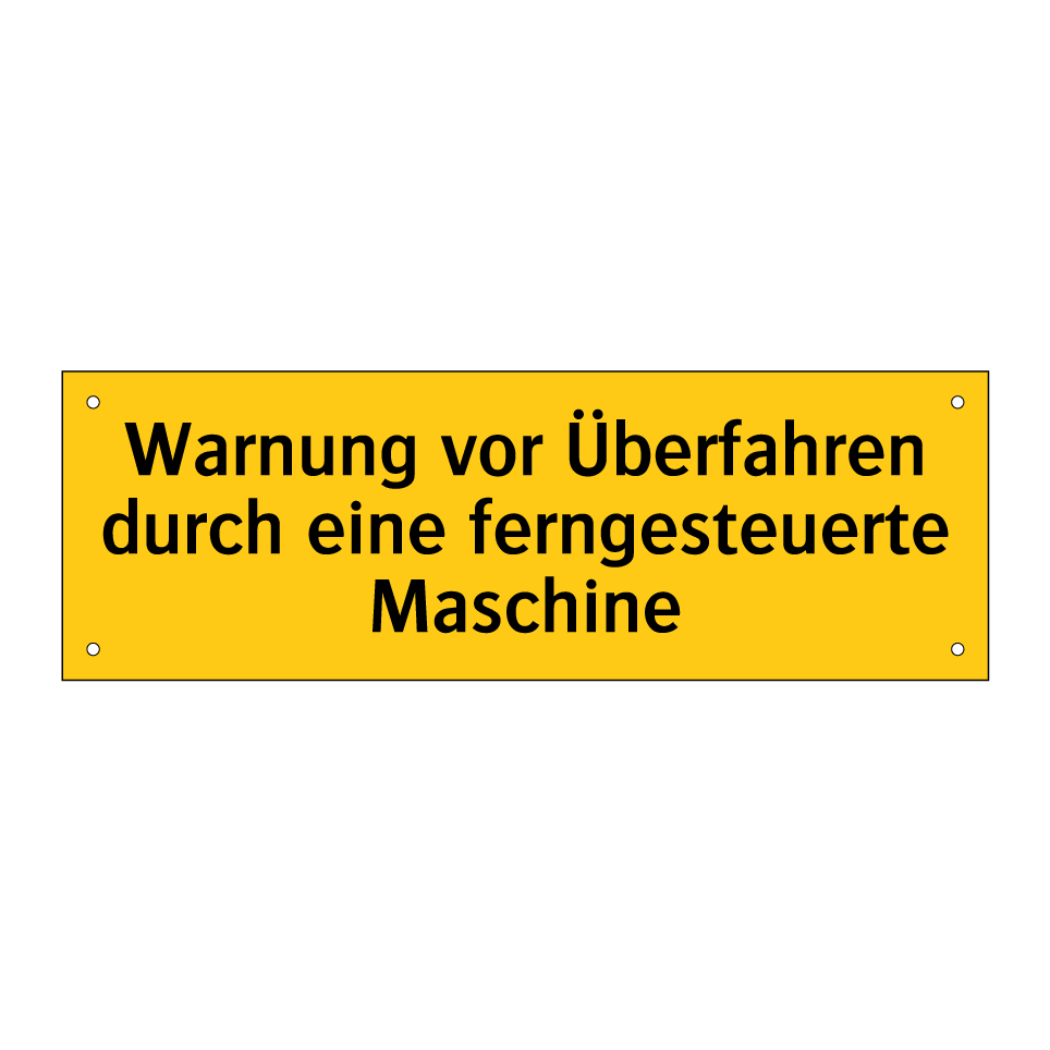 Warnschild mit dem Text Warnung vor Überfahren durch eine ferngesteuerte Maschine