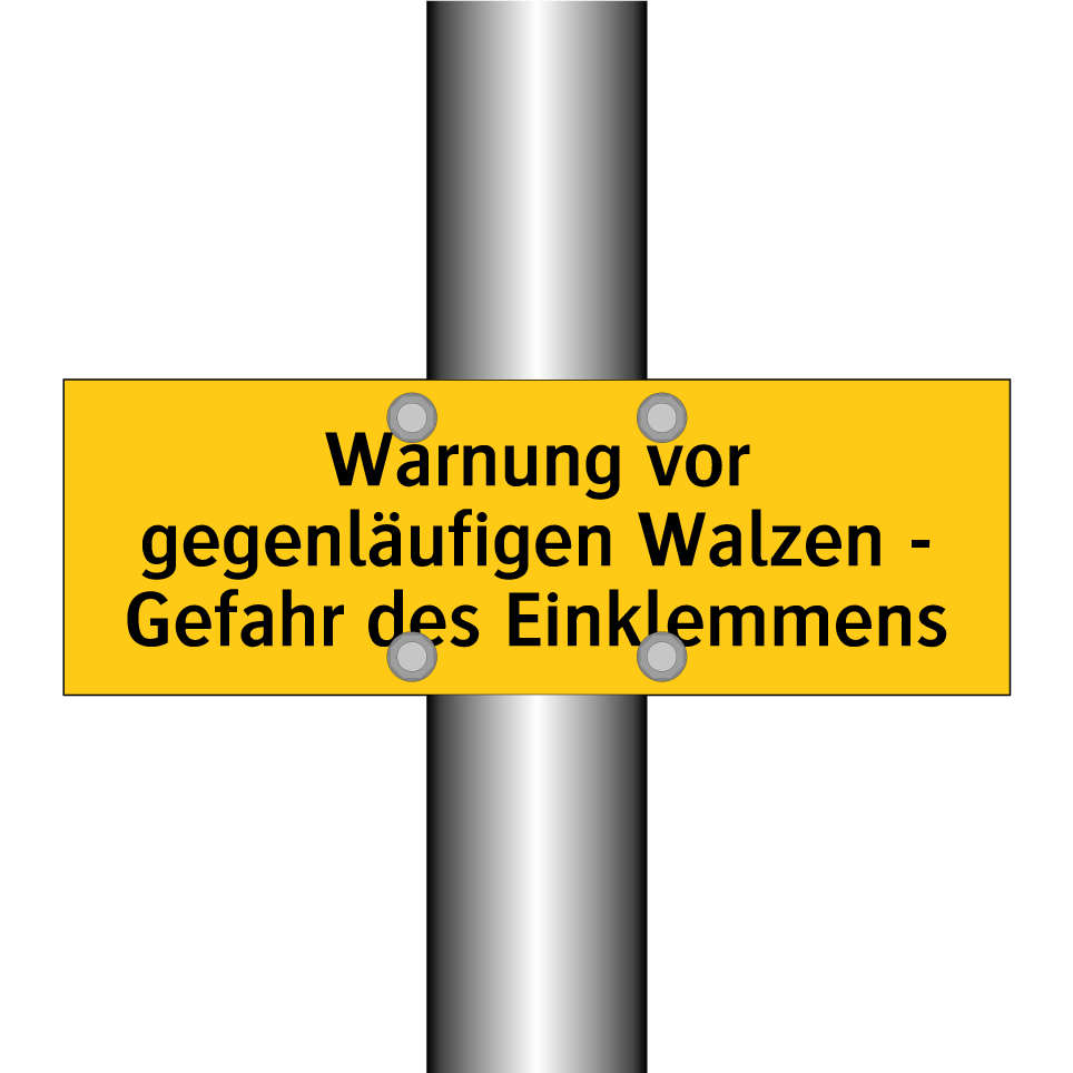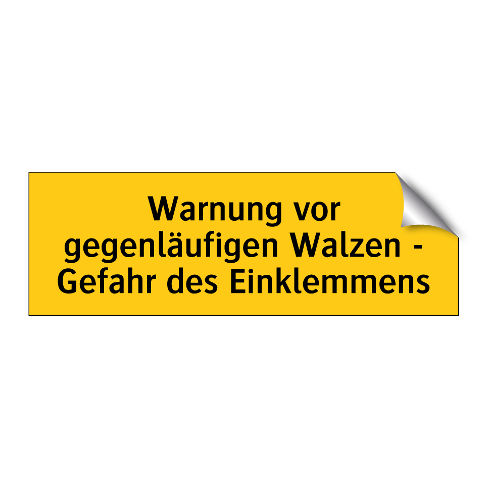 Warnschild mit dem Text Warnung vor gegenläufigen Walzen - Gefahr des Einklemmens