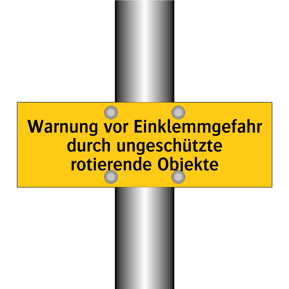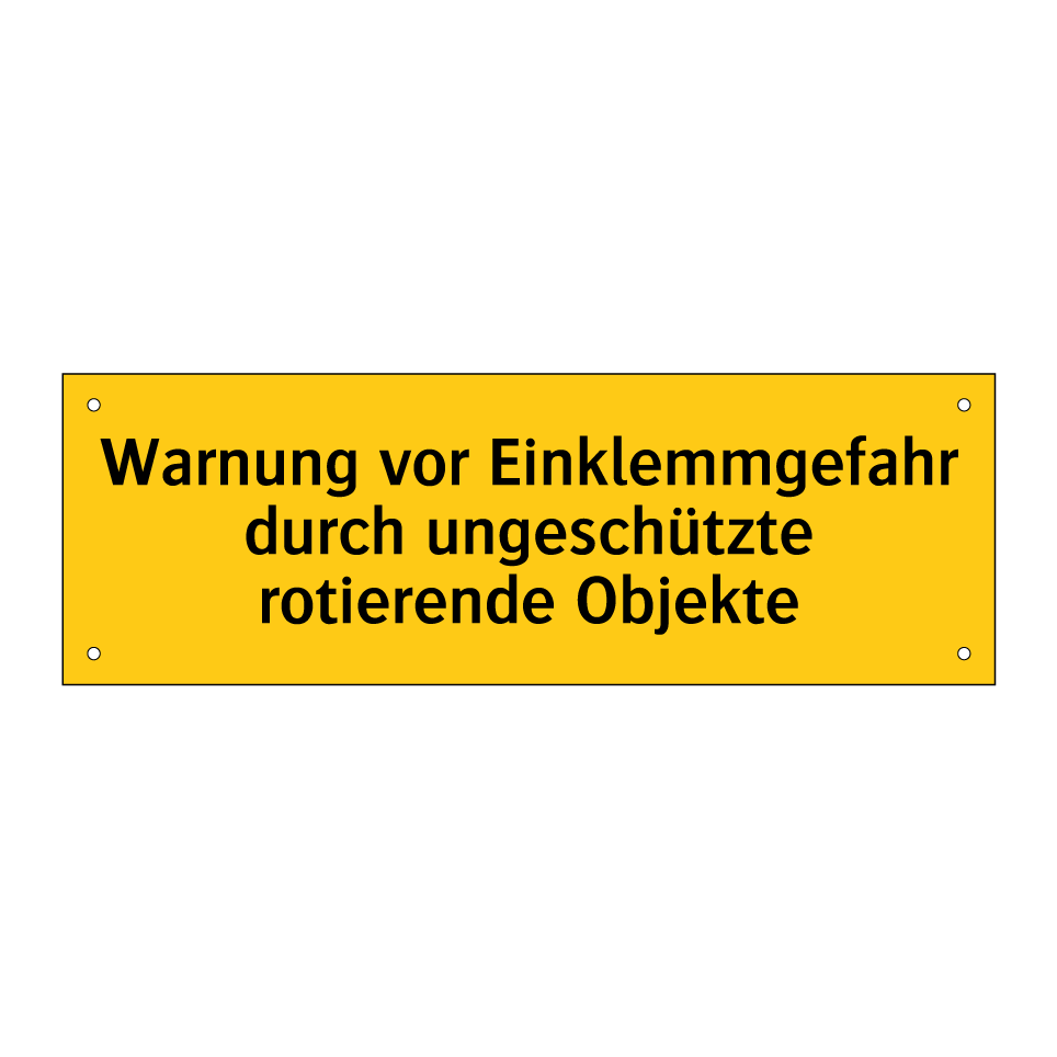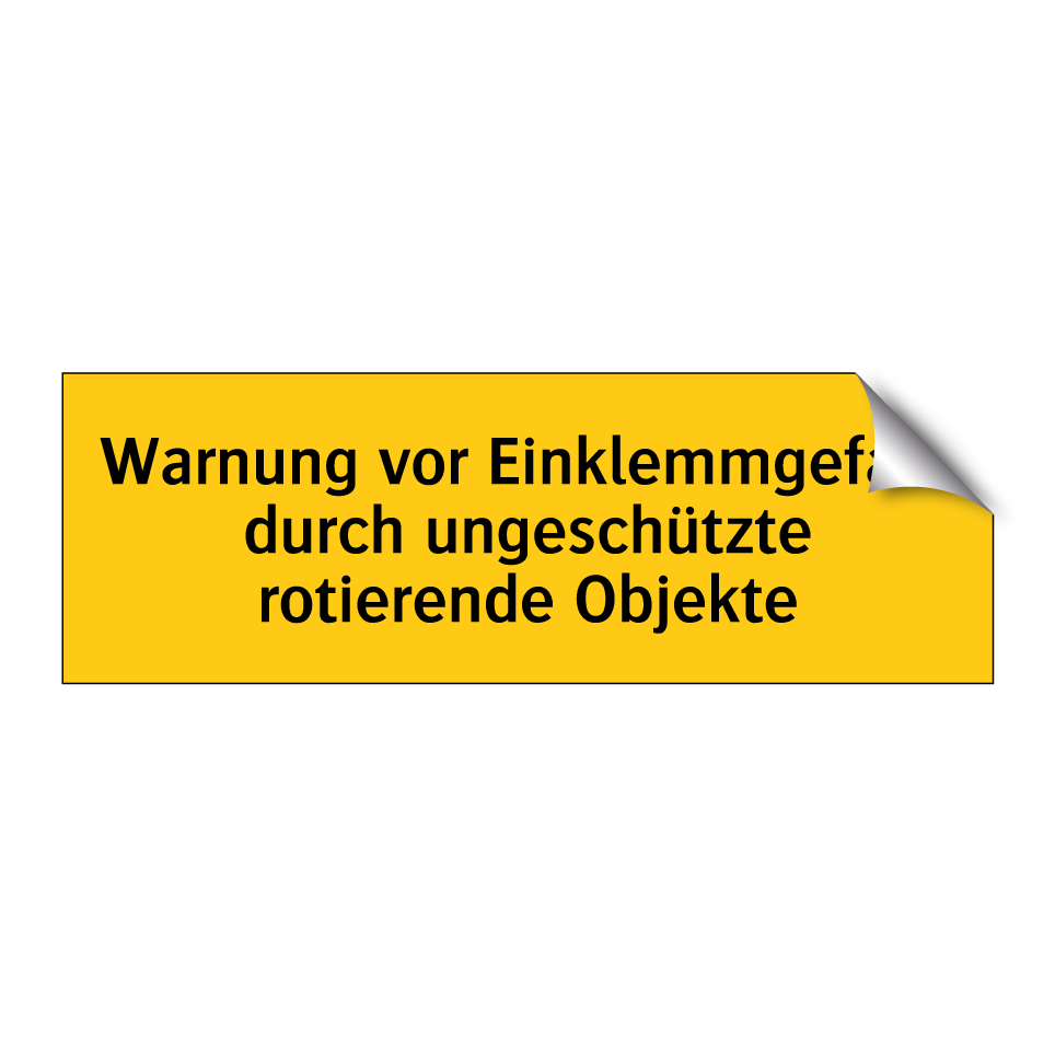 Warnschild mit dem Text Warnung vor Einklemmgefahr durch ungeschützte rotierende Objekte