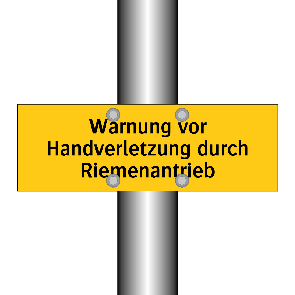Warnschild mit dem Text Warnung vor Handverletzung durch Riemenantrieb
