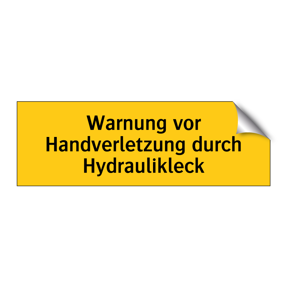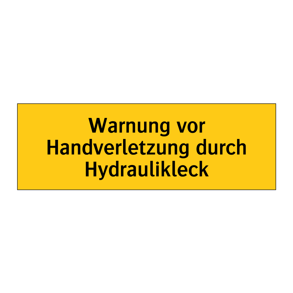 Warnschild mit dem Text Warnung vor Handverletzung durch Hydraulikleck