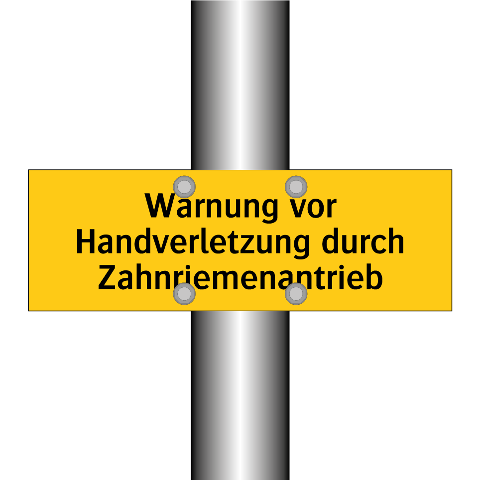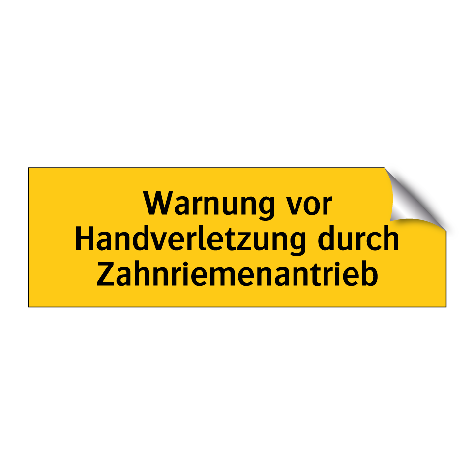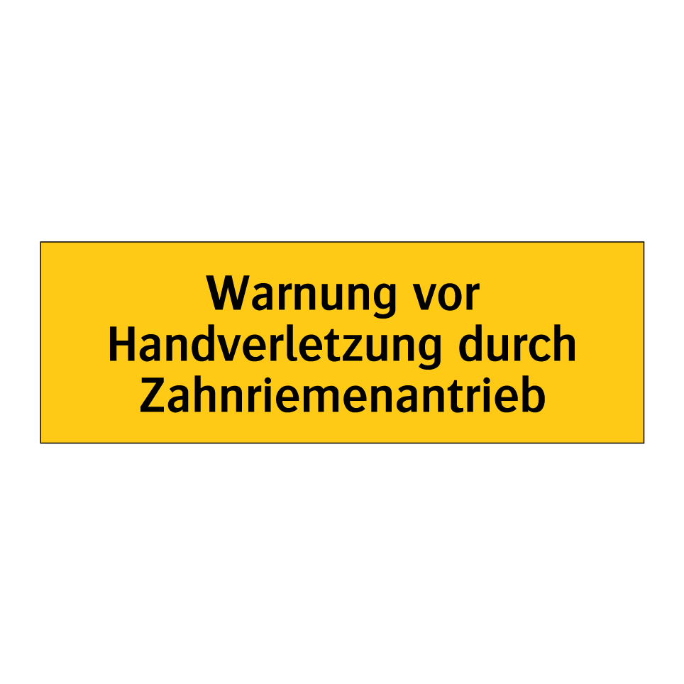 Warnschild mit dem Text Warnung vor Handverletzung durch Zahnriemenantrieb