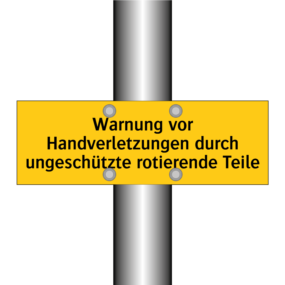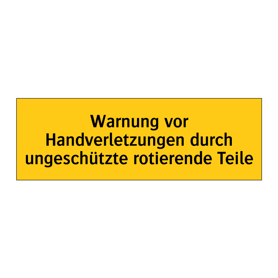 Warnschild mit dem Text Warnung vor Handverletzungen durch ungeschützte rotierende Teile