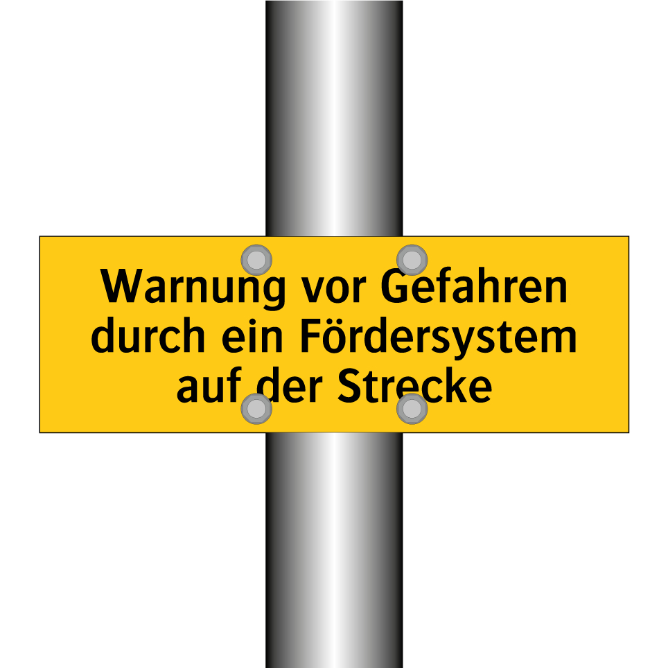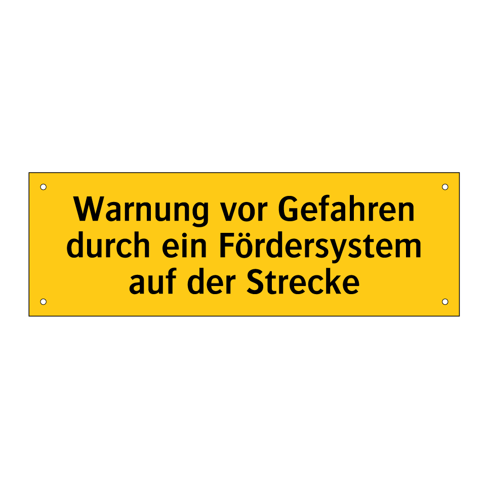 Warnschild mit dem Text Warnung vor Gefahren durch ein Fördersystem auf der Strecke