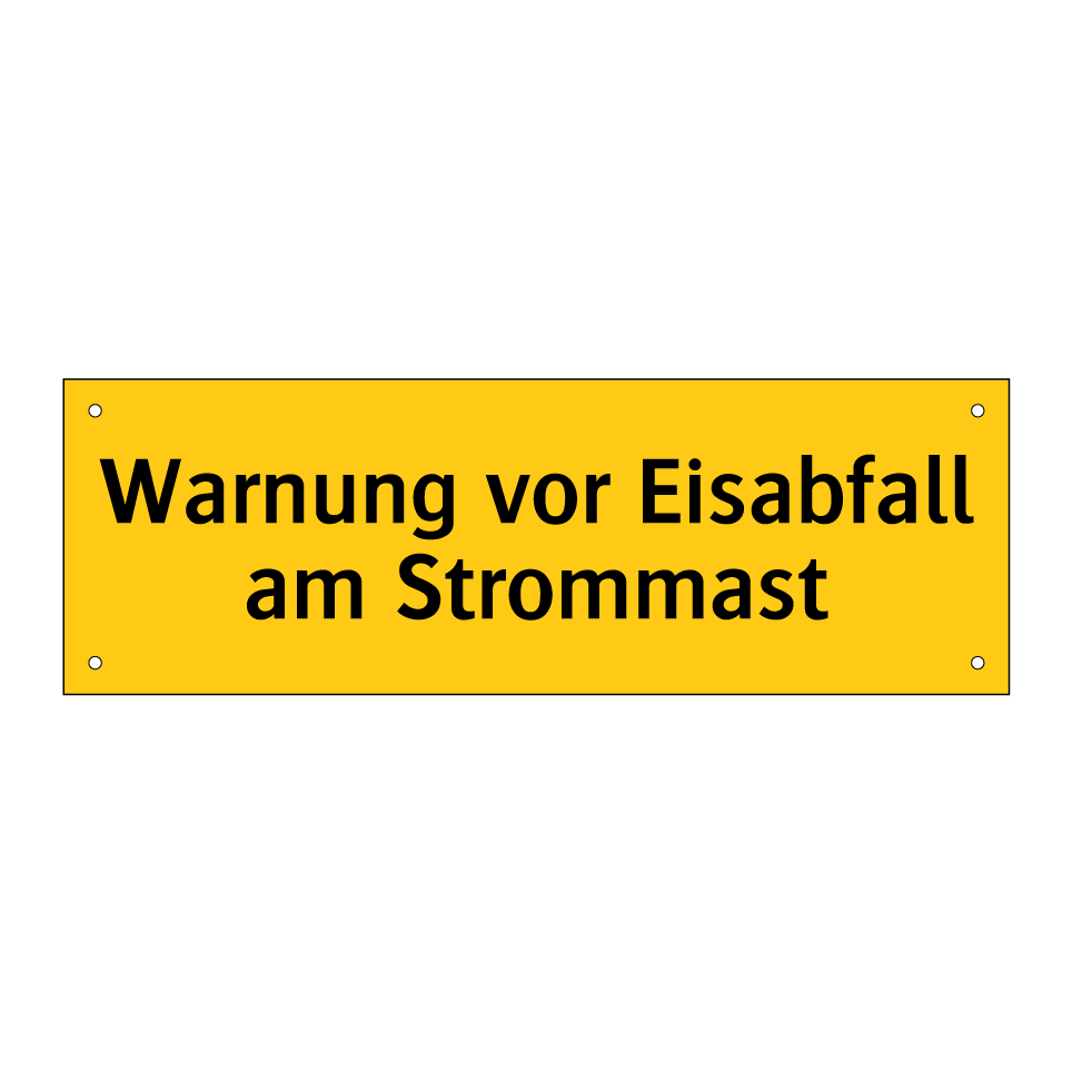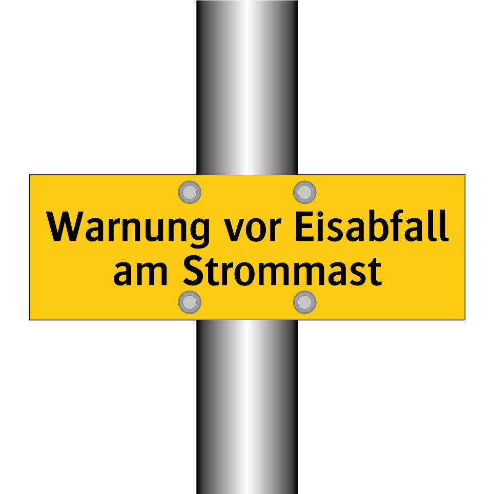 Warnschild mit dem Text Warnung vor Eisabfall am Strommast