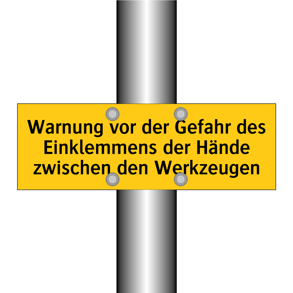 Warnschild mit dem Text Warnung vor der Gefahr des Einklemmens der Hände zwischen den Werkzeugen