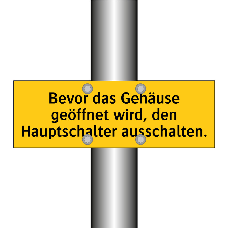 Warnschild mit dem Text Bevor das Gehäuse geöffnet wird, den Hauptschalter ausschalten.