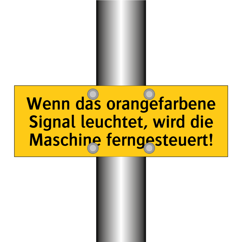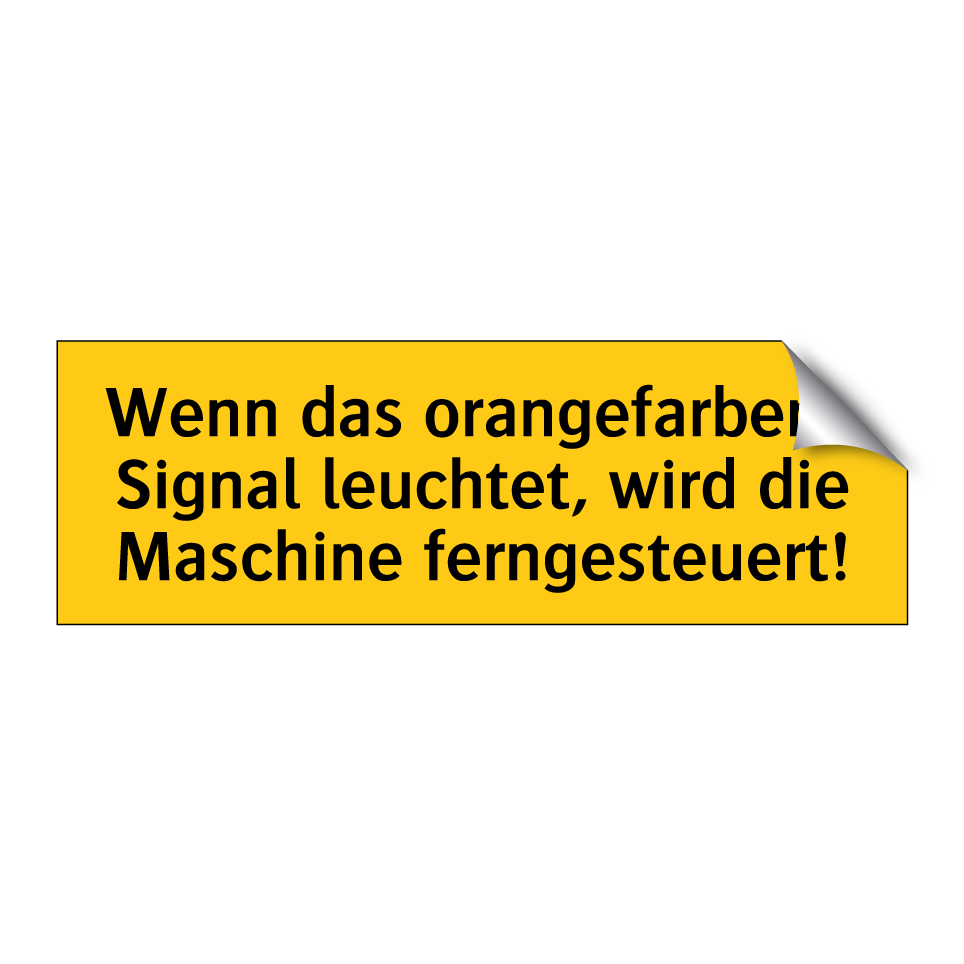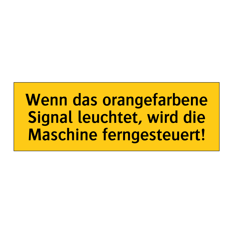 Warnschild mit dem Text Wenn das orangefarbene Signal leuchtet, wird die Maschine ferngesteuert!