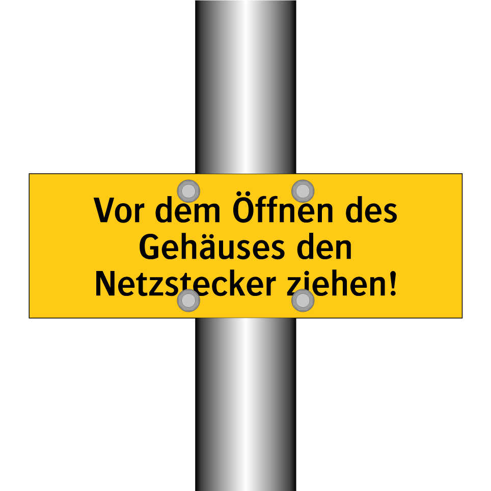 Warnschild mit dem Text Vor dem Öffnen des Gehäuses den Netzstecker ziehen!