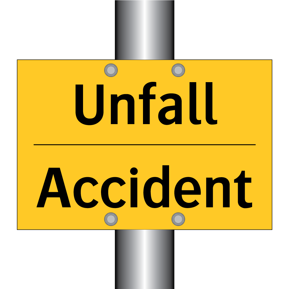 Zweisprachiges Warnschild mit deutschem Text Unfall und englischem Text Accident