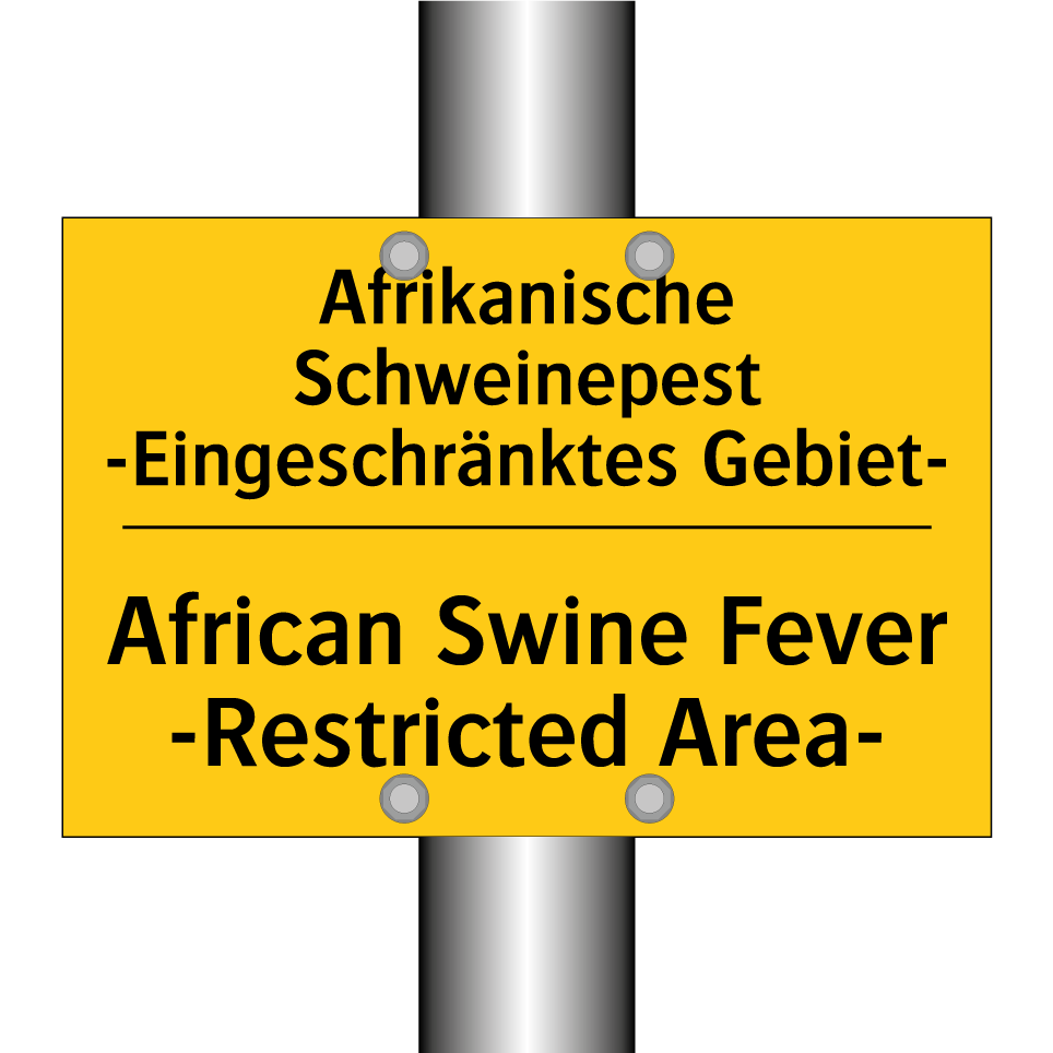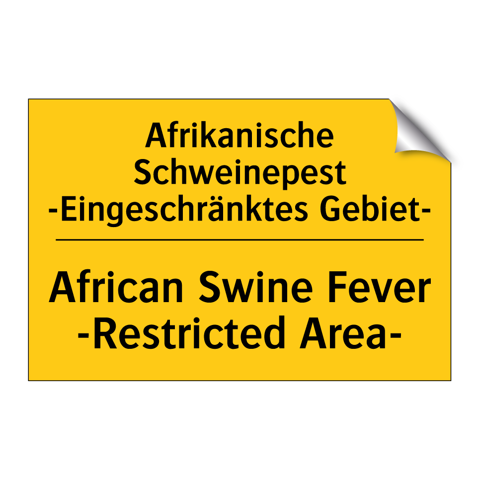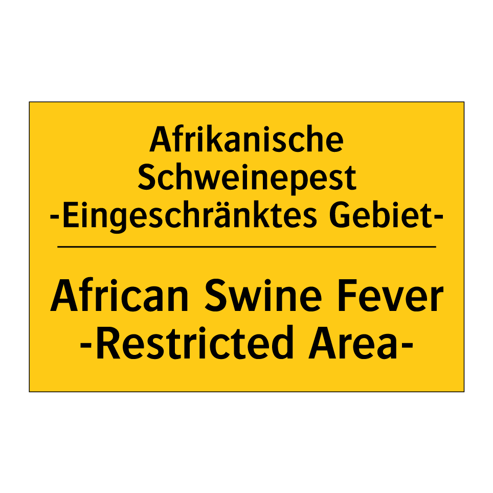 Zweisprachiges Warnschild mit deutschem Text Afrikanische Schweinepest -Eingeschränktes Gebiet- und englischem Text African Swine Fever -Restricted Area-