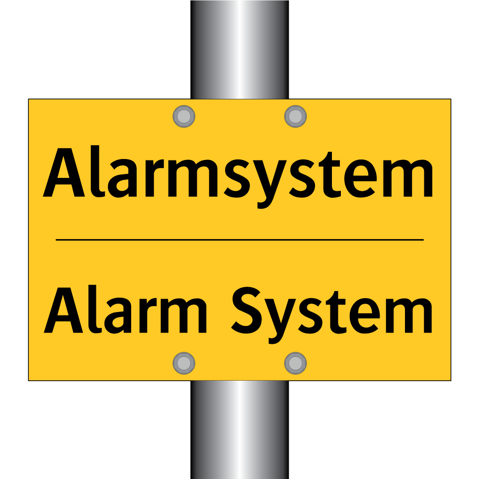 Zweisprachiges Warnschild mit deutschem Text Alarmsystem und englischem Text Alarm System